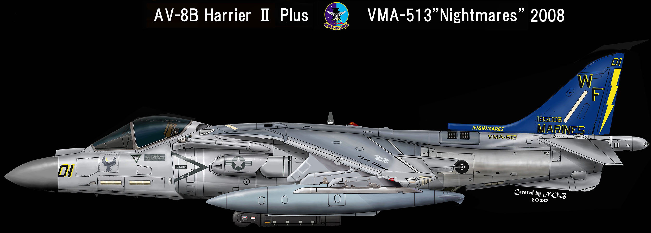↑ 2007年レーダーハリアーに施されたブルーテールの綺麗なマーキングがこれである。他の飛行隊のブラックテールへの対抗もあったかもしれないが 悪夢の暗い夜空をイメージしたものであろう。マニアからの評価の高いマーキングであった。記入された文字は斜文字が使われている。Bu.No.165385