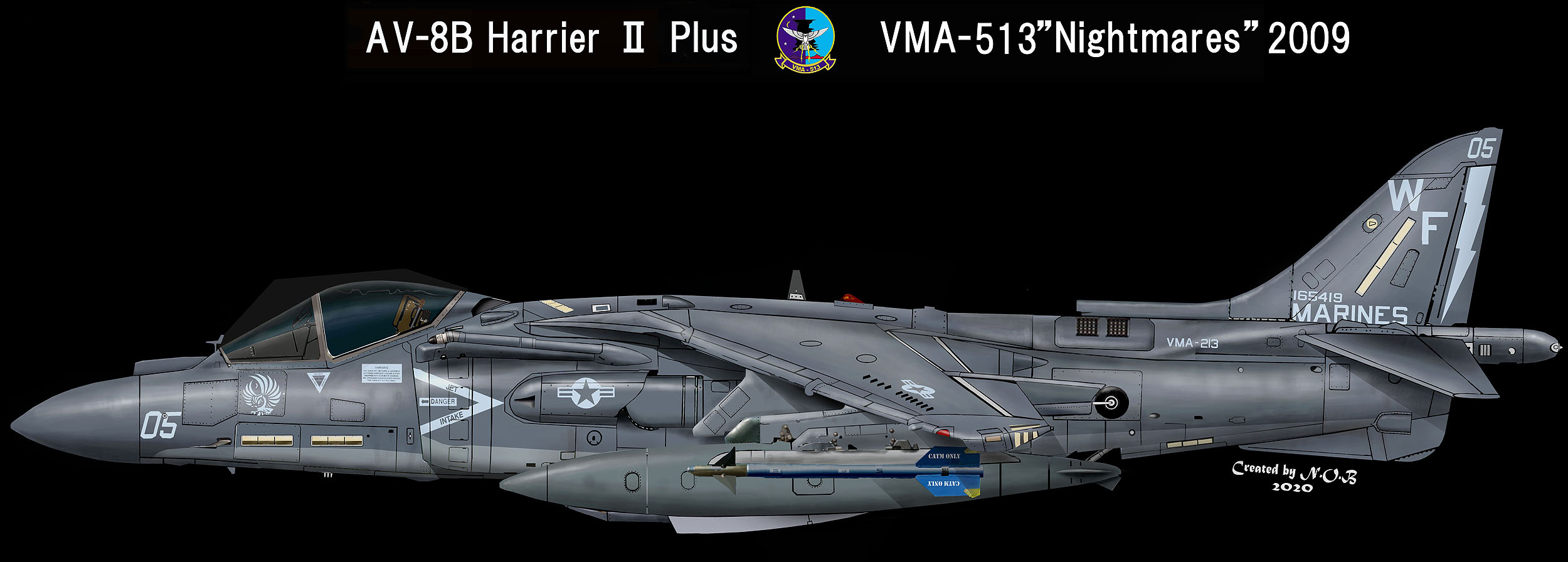 ↑2009年頃の部隊の標準マーキングの1つ。部隊の中にはライトグレーのハリアーとこのダークグレーを基調としたハリアーも同時に混在していた。機首には新しく考案されたフクロウのシルエットが描かれ始めた。Bu.No.165419