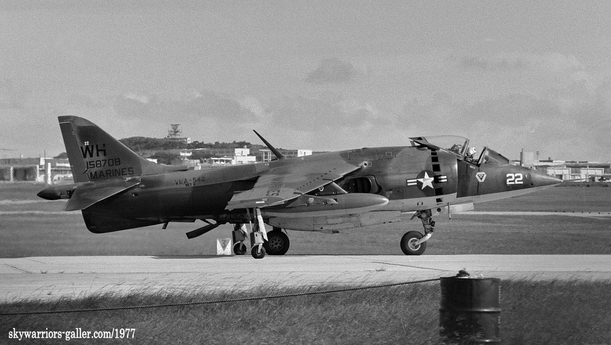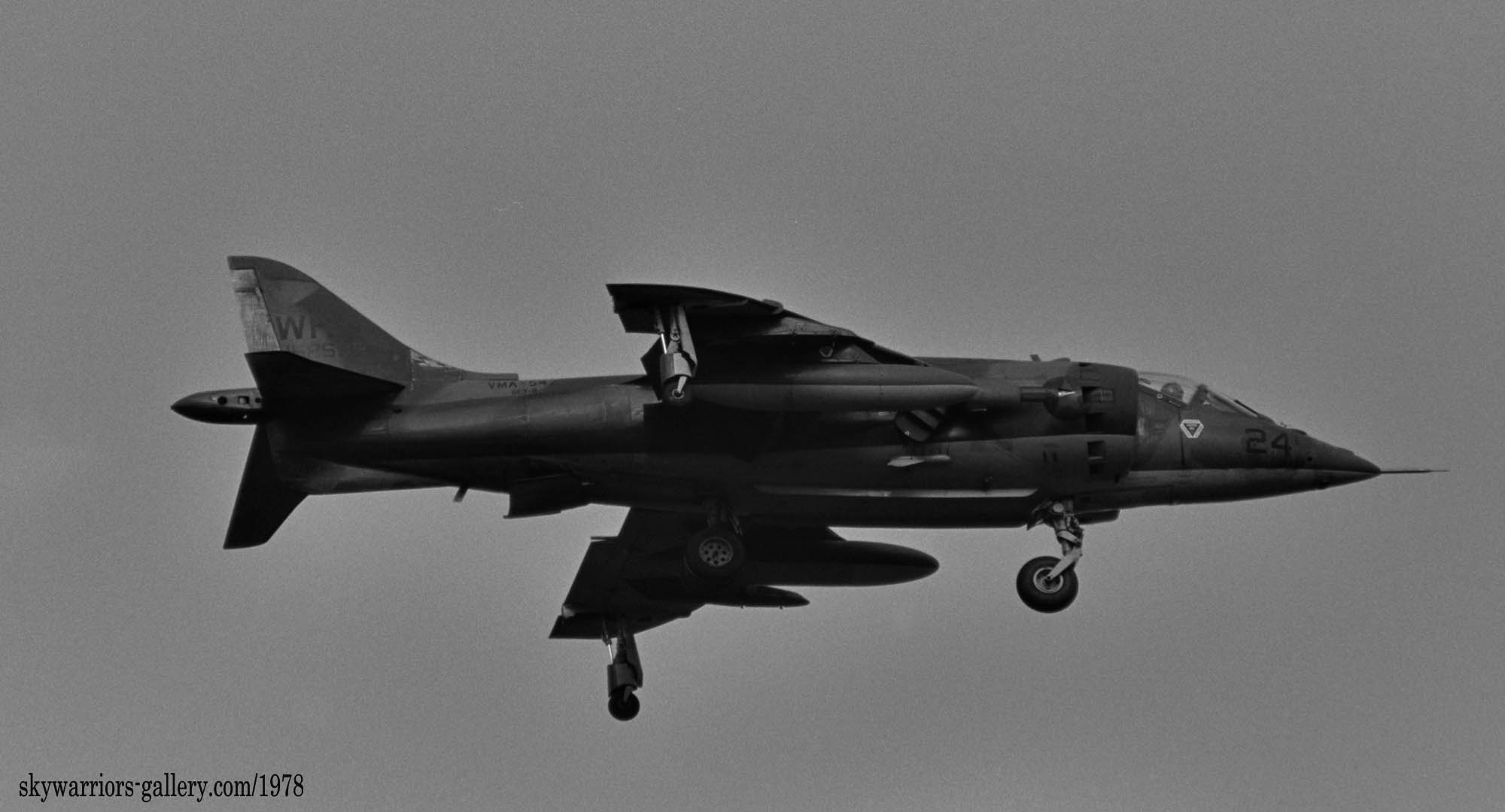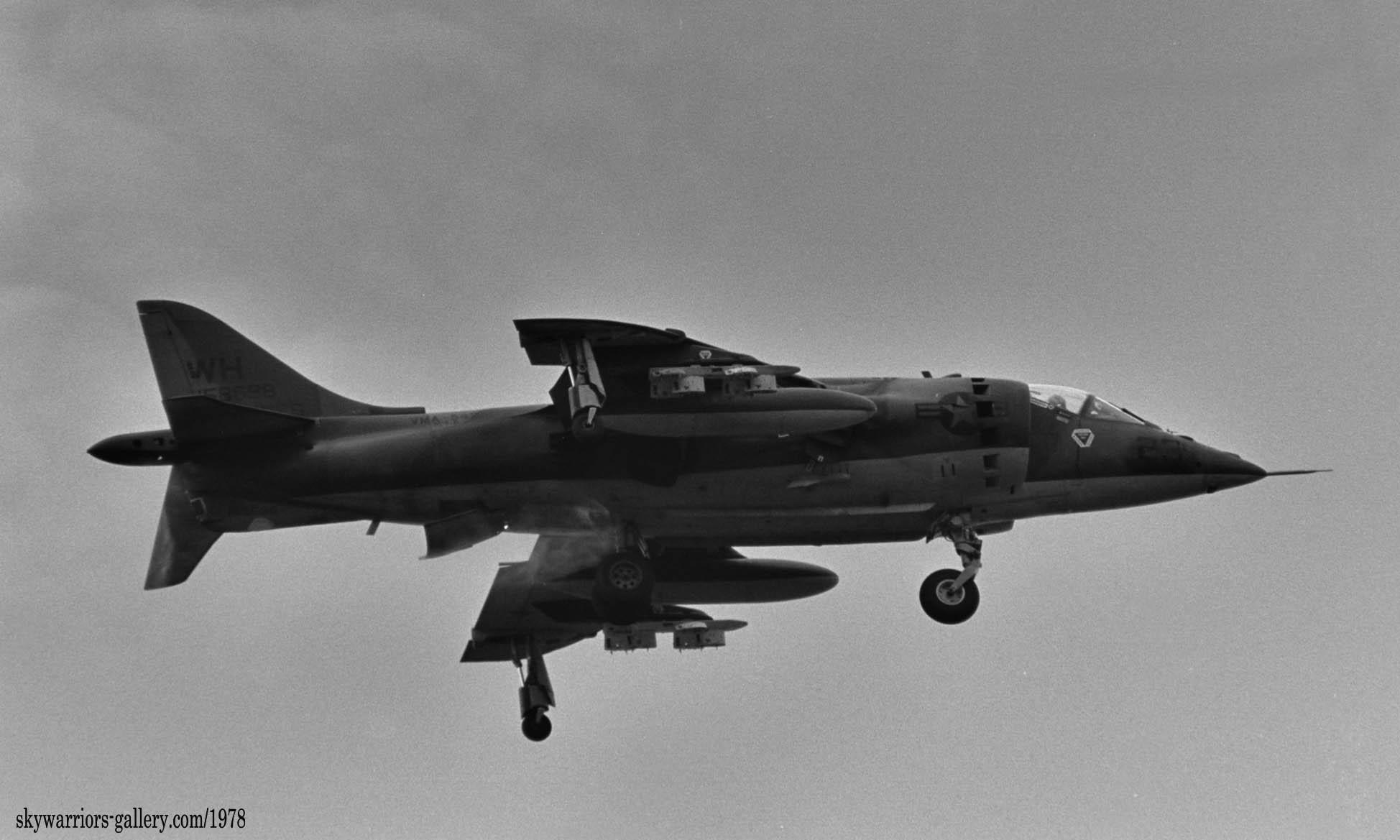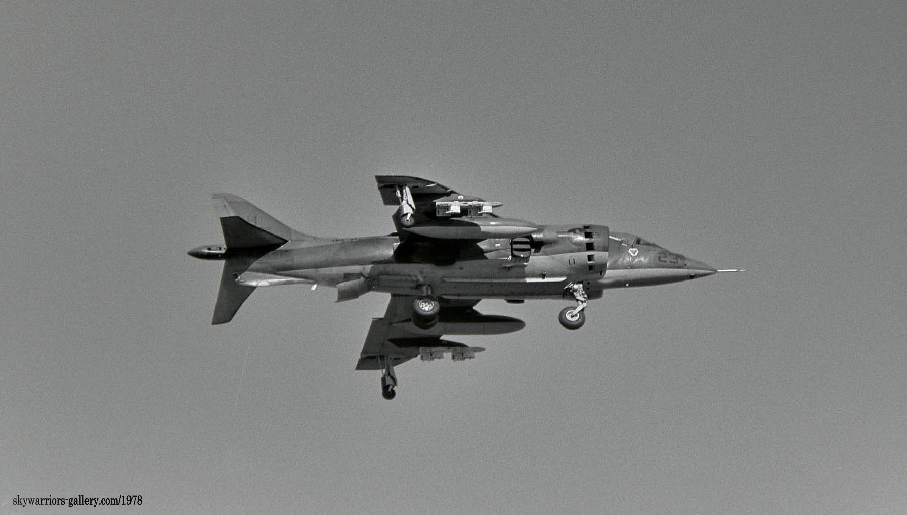 ↑ 1978年9月 嘉手納で飛行訓練をするVMA-542のAV-8A。1977年の岩国駐留に次いで2回目のAV-8Bとしての岩国基地派遣となったが、尾翼の虎模様は海兵隊で進められた低視認性塗装の徹底化により、暫くの間消えて行くことになる。1986年4月には、A型からAV-8Bに機種交換された。
