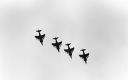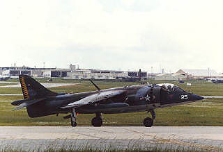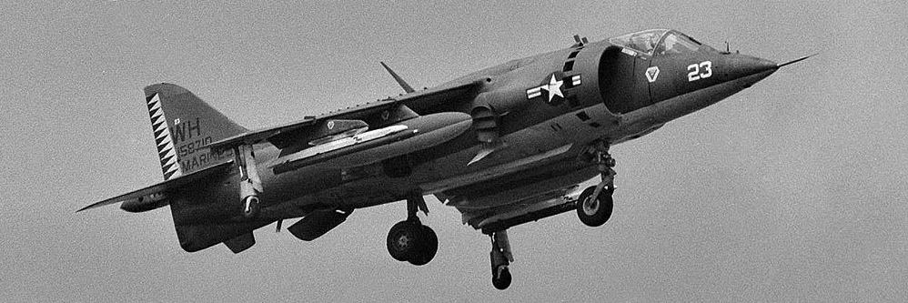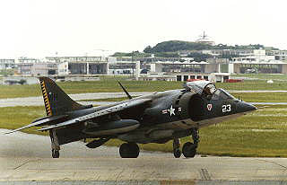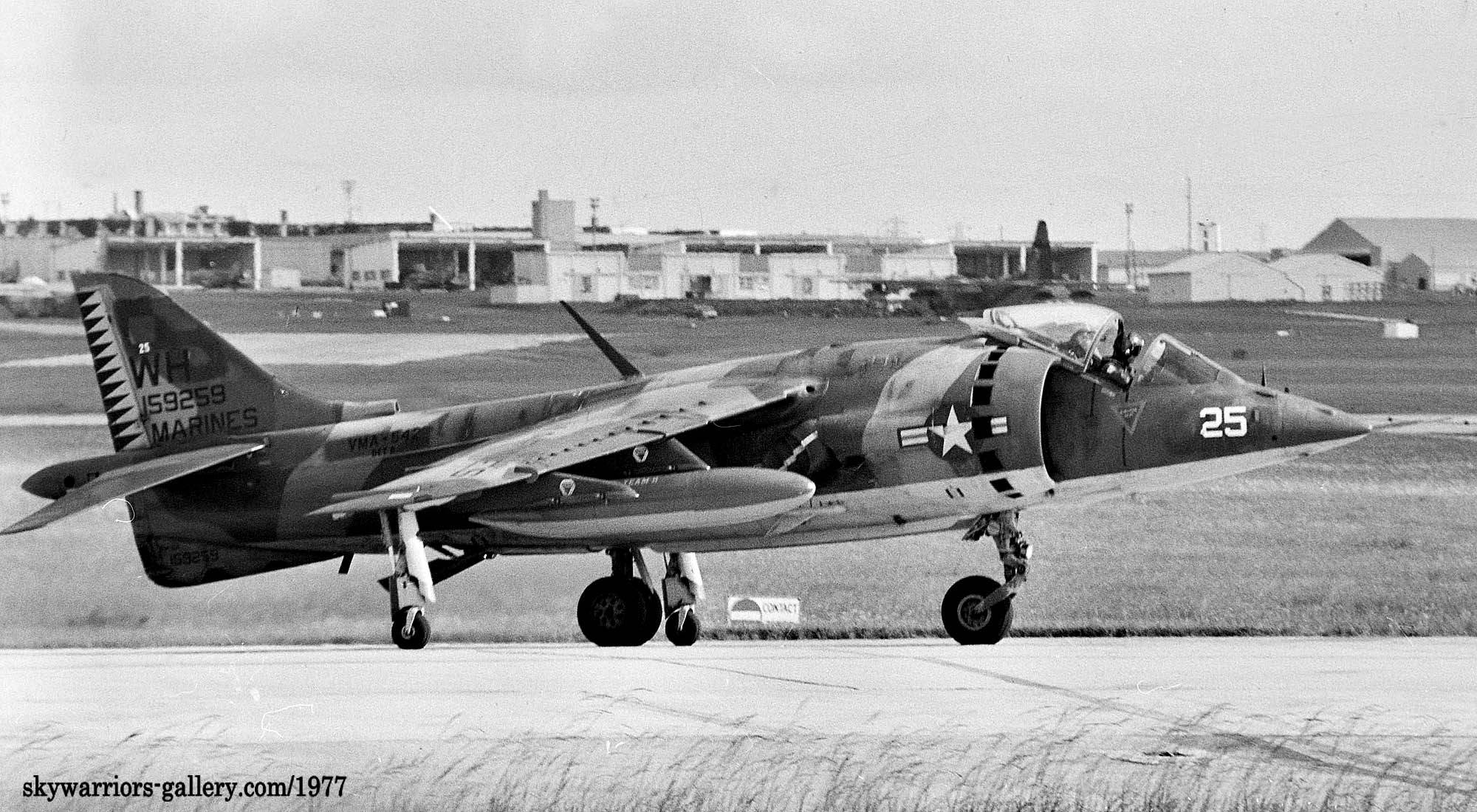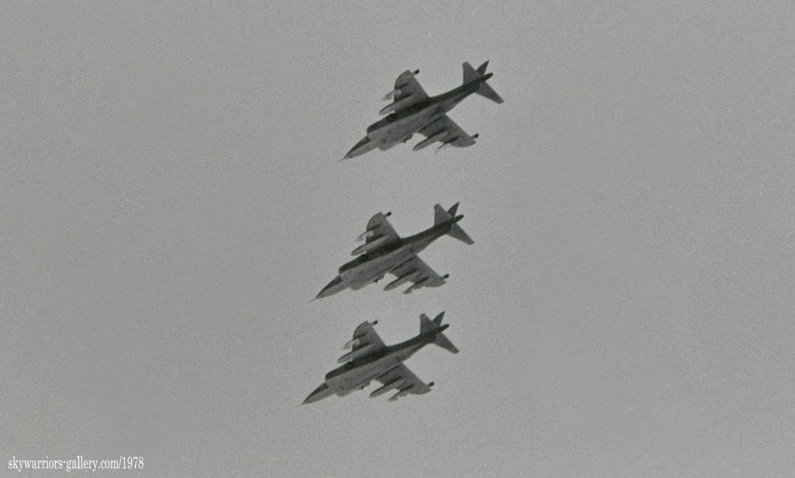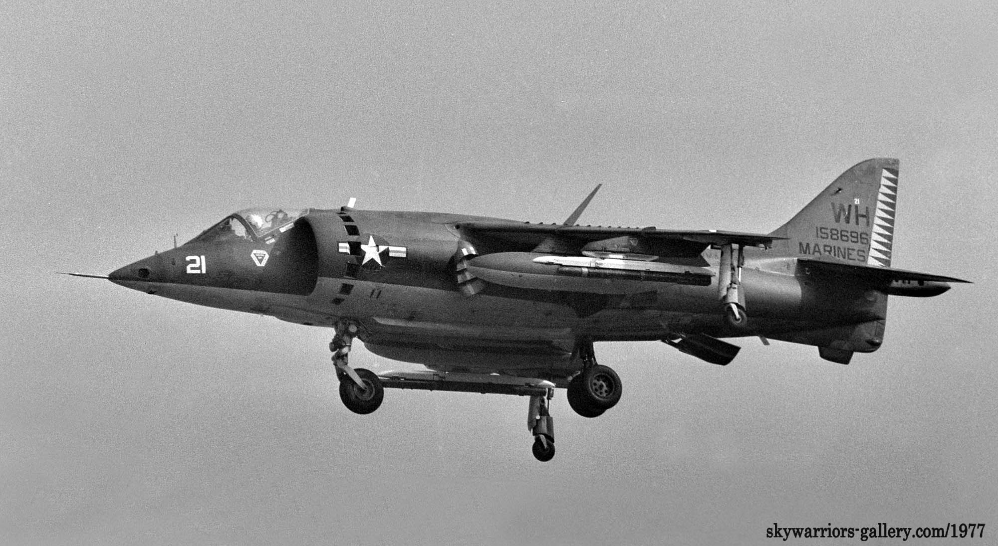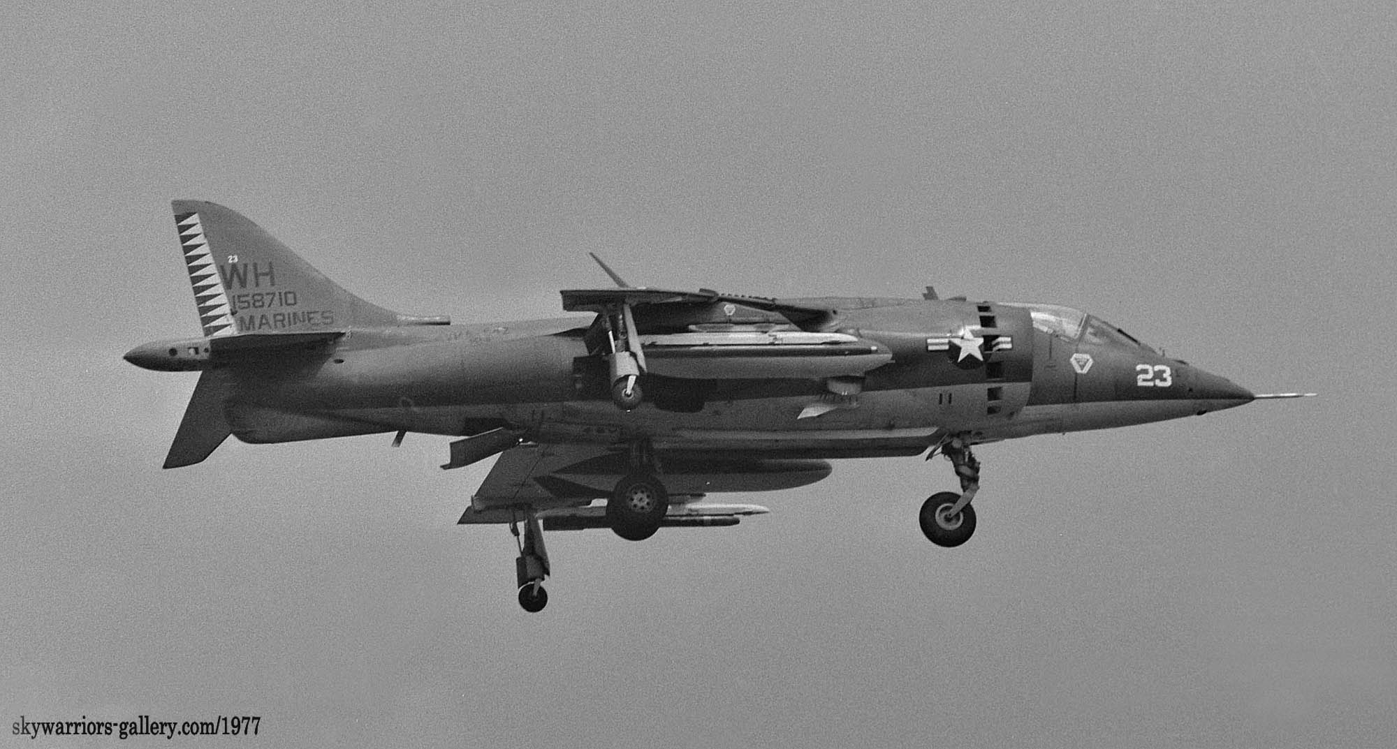 ↑ 1978年9月 嘉手納で飛行訓練をするVMA-542のAV-8A。1977年の岩国駐留に次いで2回目のAV-8Bとしての岩国基地派遣となったが、尾翼の虎模様は海兵隊で進められた低視認性塗装の徹底化により、暫くの間消えて行くことになる。1986年4月には、A型からAV-8Bに機種交換された。