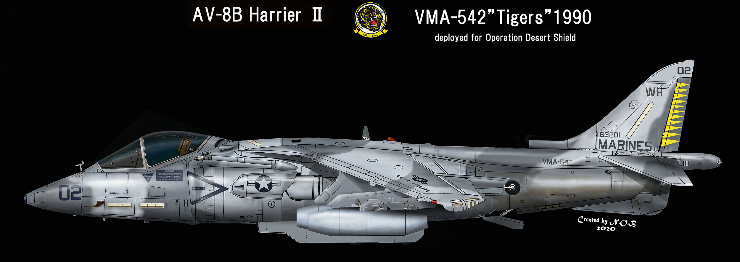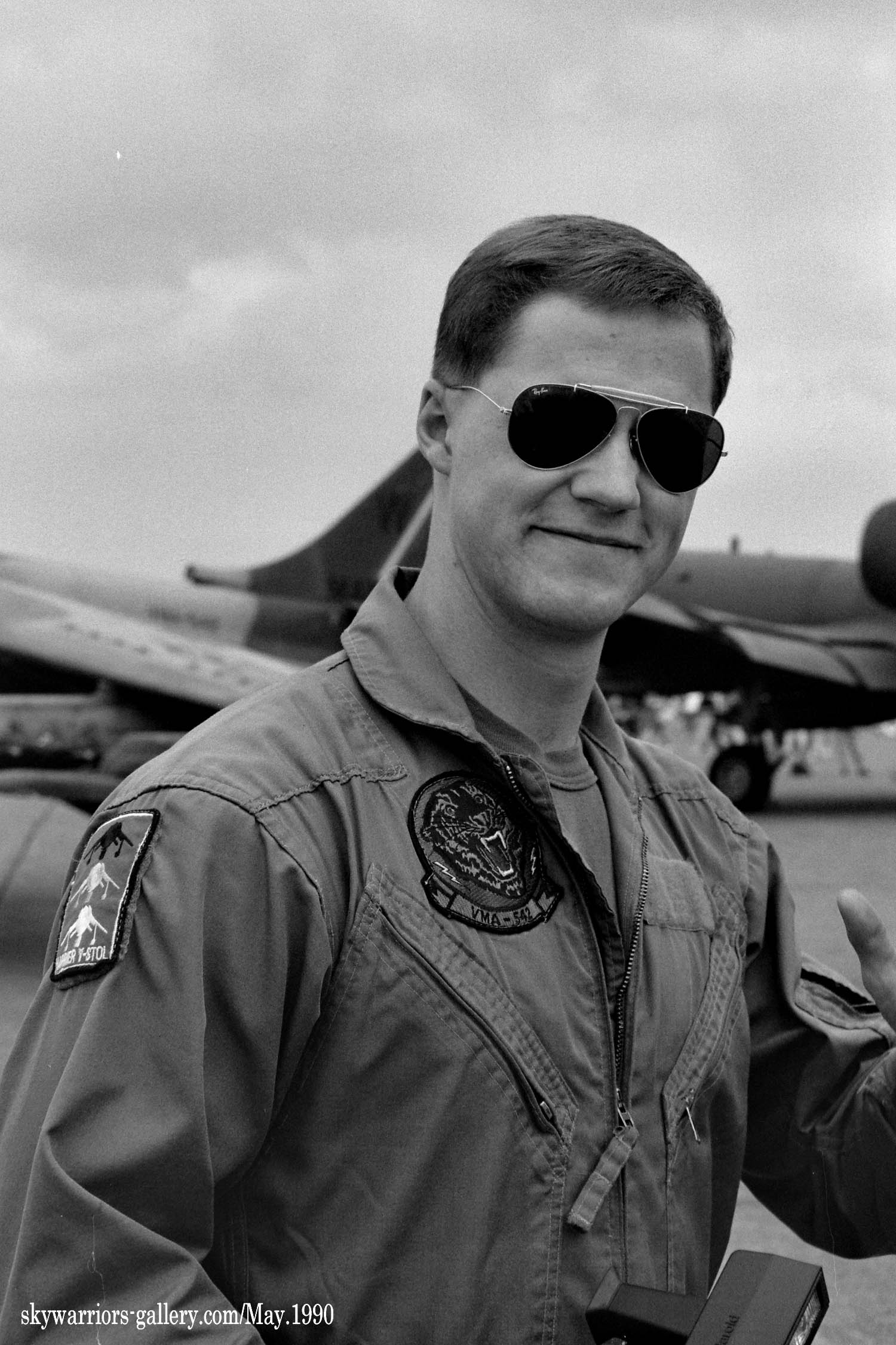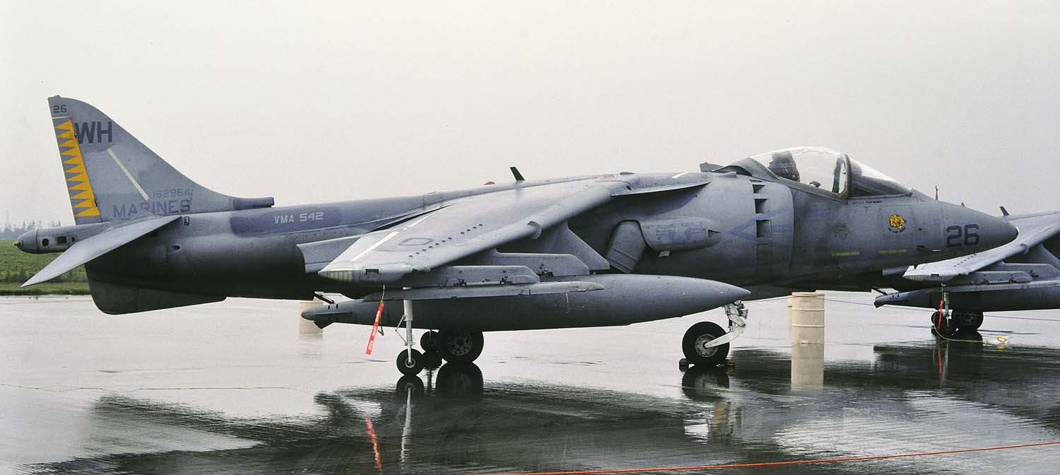 1989年12月 新型のAV-8BハリアーⅡに更新されて岩国に配備されたVMA-543。1990年1月に韓国に向かう途中、伊江島付近で墜落事故が発生、早速1機を失っている。翌年1990年5月20日厚木のオープンハウスでは、VMA-542のハリアーⅡが3機もエプロンに並びハリアーファンを喜ばせた。この時に展示された機体は、WH-01、WH-04、WH-06でグリーン系の迷彩に機種に薄いホワイトグレーでトラの頭が描かれていた。