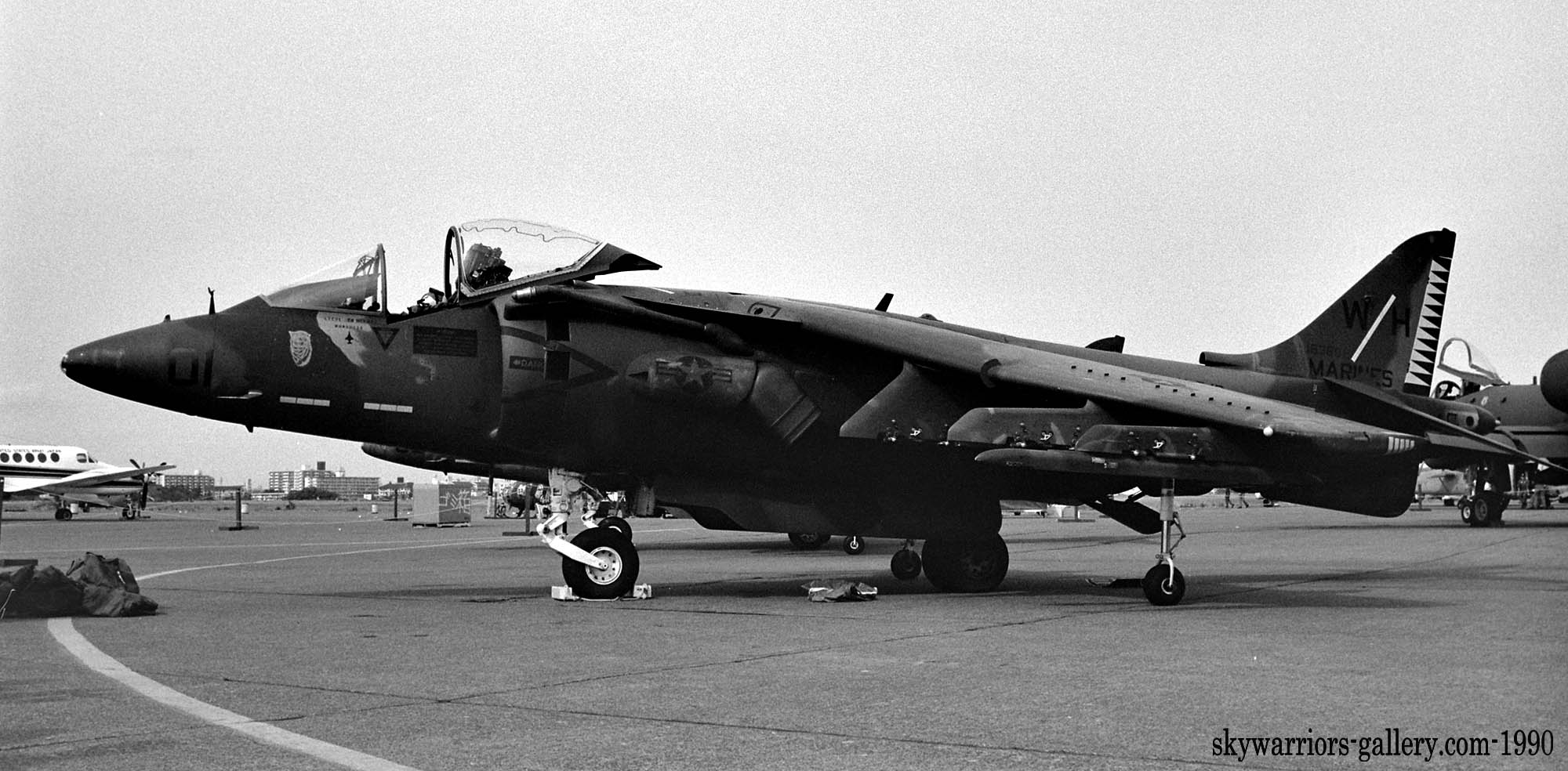 ↑1990年5月 岩国のエプロンに駐機していた、2機のVMA-542所属のAV-8B。WH-10/Bu.No.162967とWH-07/Bu.No.162962である。