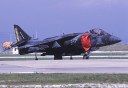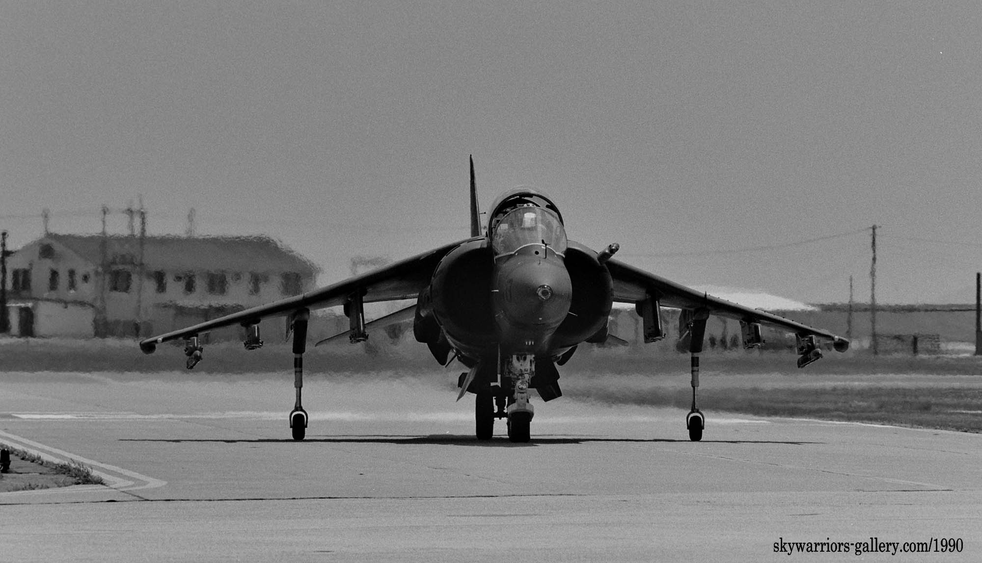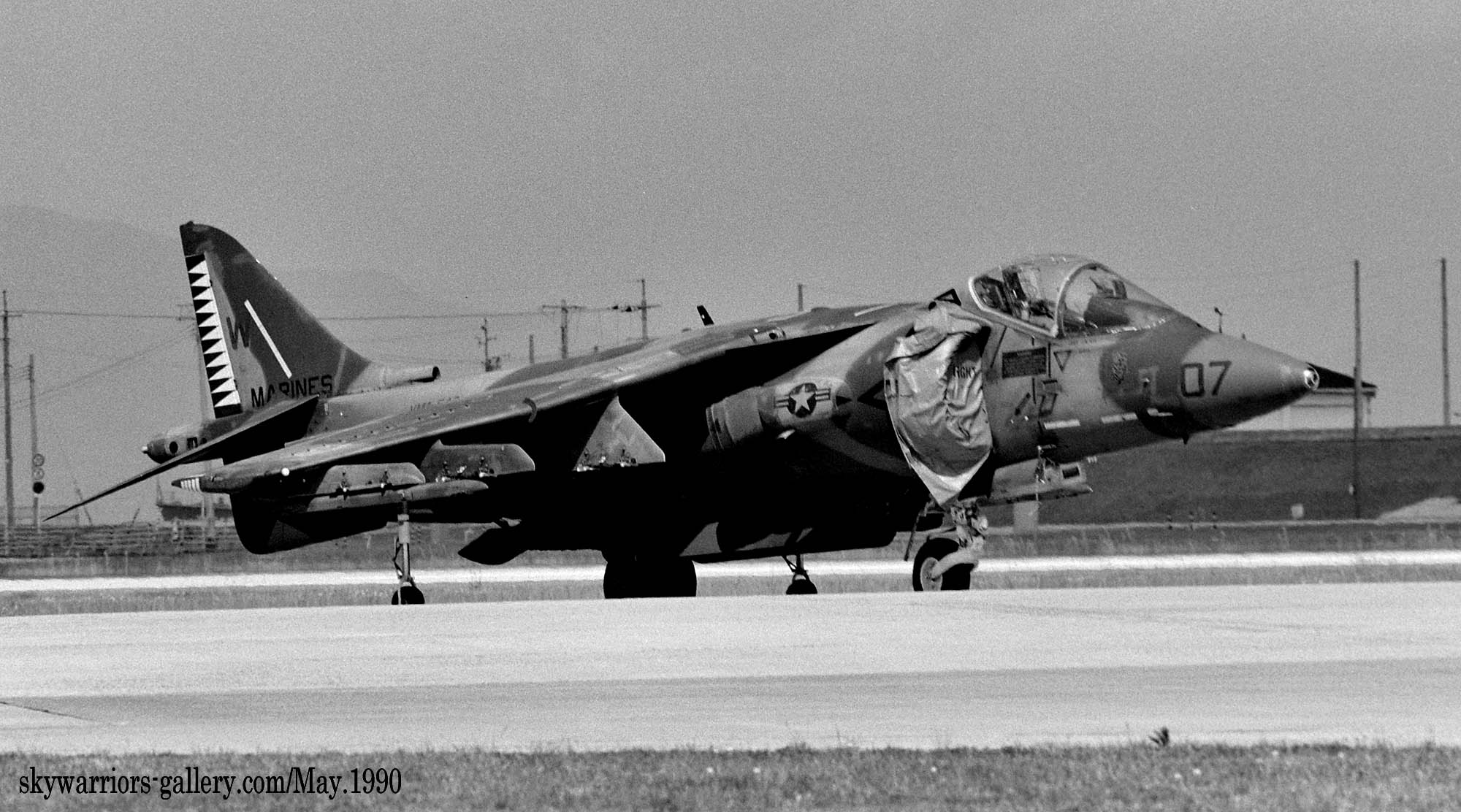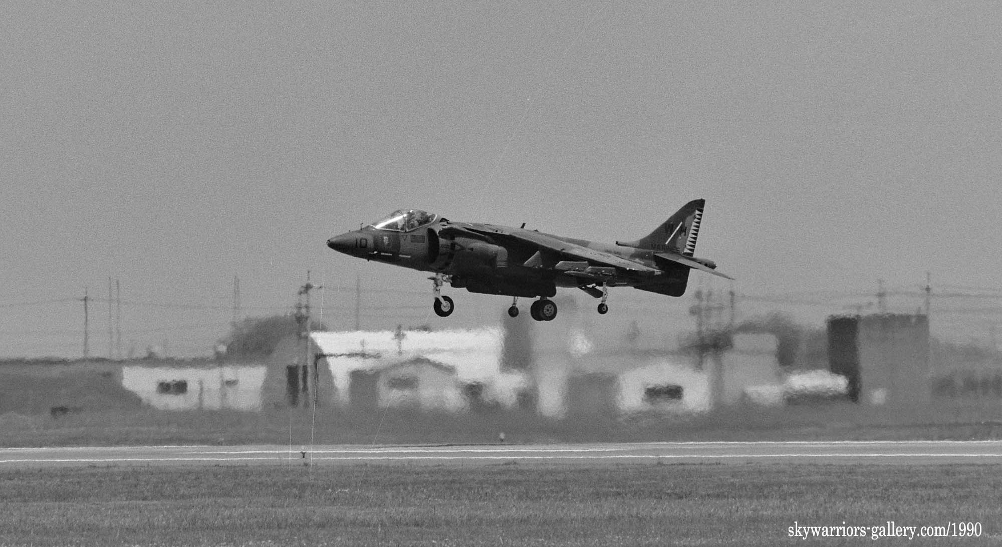 1990年5月岩国基地で展示飛行を終えエプロンに向かいタキシーするVMA-542のAV-8B/WH-10/Bu.No.162967。グリーン系迷彩にラダーの黒黄の虎模様は非常に映えるのであるが、この後発生する湾岸戦争以後、グリーン系迷彩は次第に姿を消していく事になる。