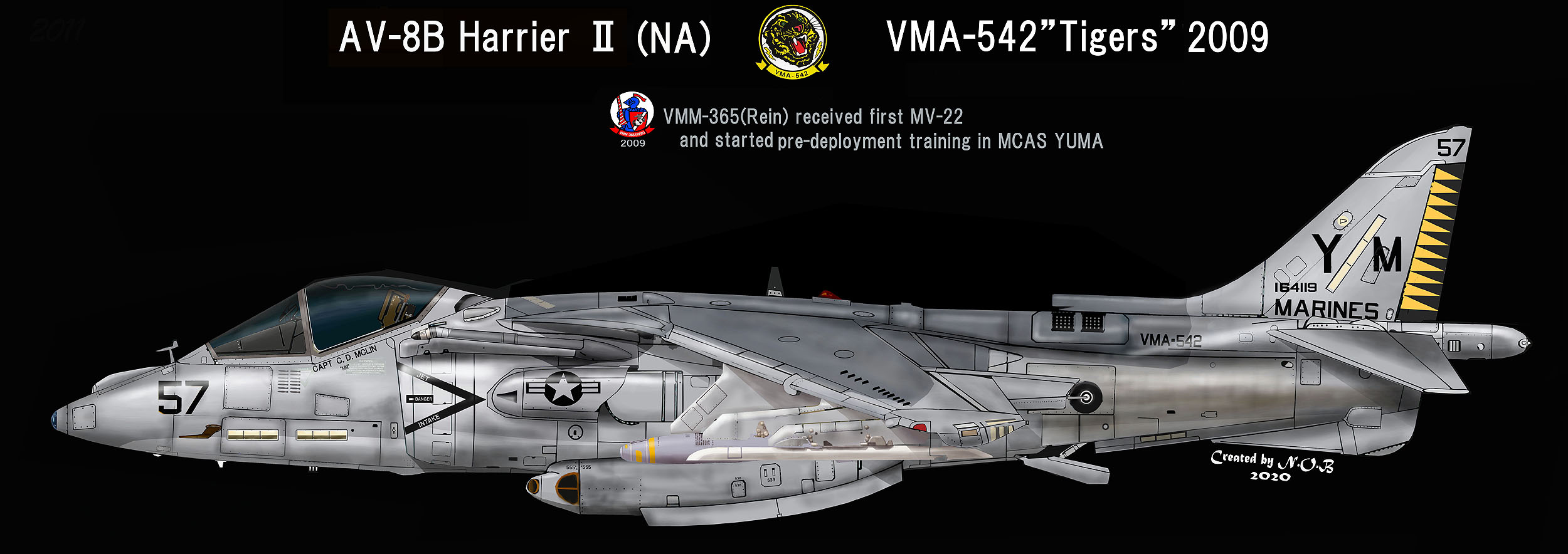 ↑ 2009年強襲揚陸艦による海兵遠征部隊の訓練に出る前、ユマ基地で飛行訓練をした時のマーキングで、既にMV-22を受領したばかりのVMM-368のテールレター”YM”を記入していた。ラダーが極めて鮮明な黄黒の虎模様に仕上げられ、恐らく艦上でも目立つ存在だったであろう。Bu. No.164119