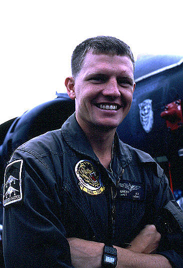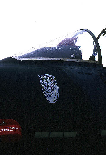 ↑ 1990年の湾岸戦争でサウジアラビアへ派遣された際の塗装例。砂漠に合わせた明るい色にオーバースプレーされているが、伝統のラダー虎模様は色付きで残されている。ラックにつけているのは、ナパーム弾で、古いタイプの兵器であるが「砂漠の盾作戦」では多量に使用されたようである。