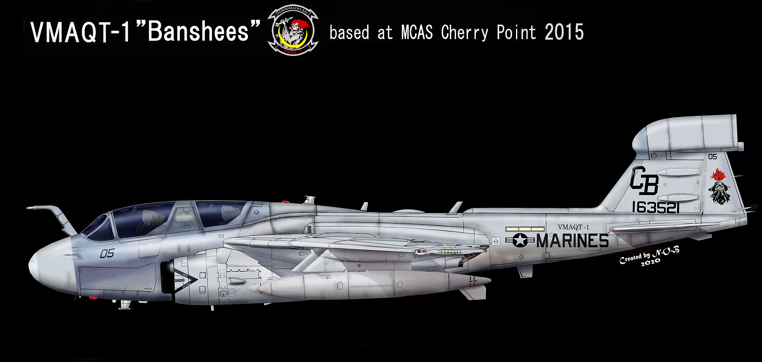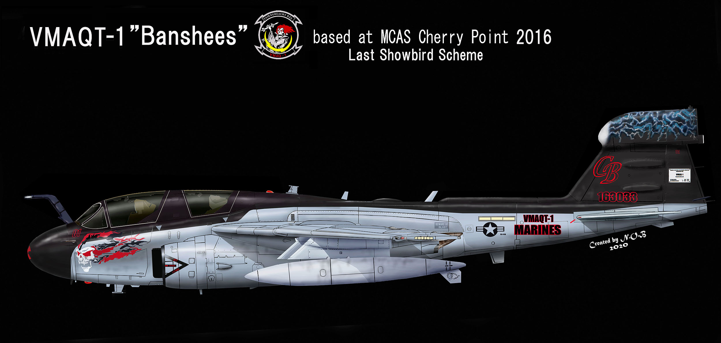 2016年部隊解散前に記念の機体として 海兵隊プラウラーで最も派手なマーキングに仕立てた。機首に大きく描かれたバンシーは、大きな牙を生やしている。引退式では、黒く塗られた2本の燃料タンクは、スタッフのサインで埋め尽くされた。その後この機体は、そのままの塗装でノースカロライナ州の博物館「Hickory Aviation Museum」で展示されることになったようだ。Bu.No163033