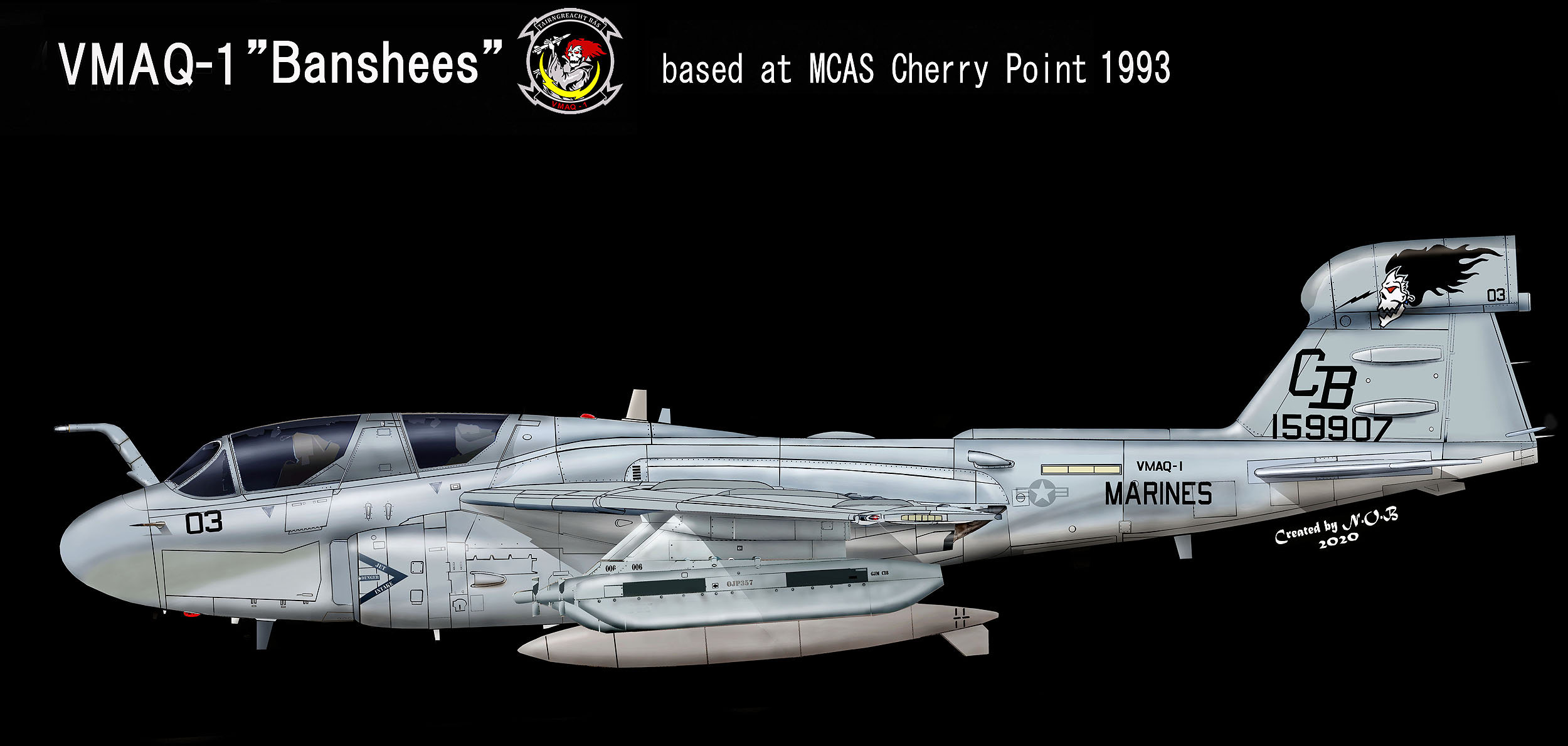 上と同じく1993年頃のバンシーで髪が黒髪 顔が白色タイプ。この頃から海兵隊のプラウラーは、機首から胴体にかけグレー3色で迷彩が施され 光の反射がしやすい場所は、暗いグレーで反射を抑制している。EA-6B Bu.No.159907