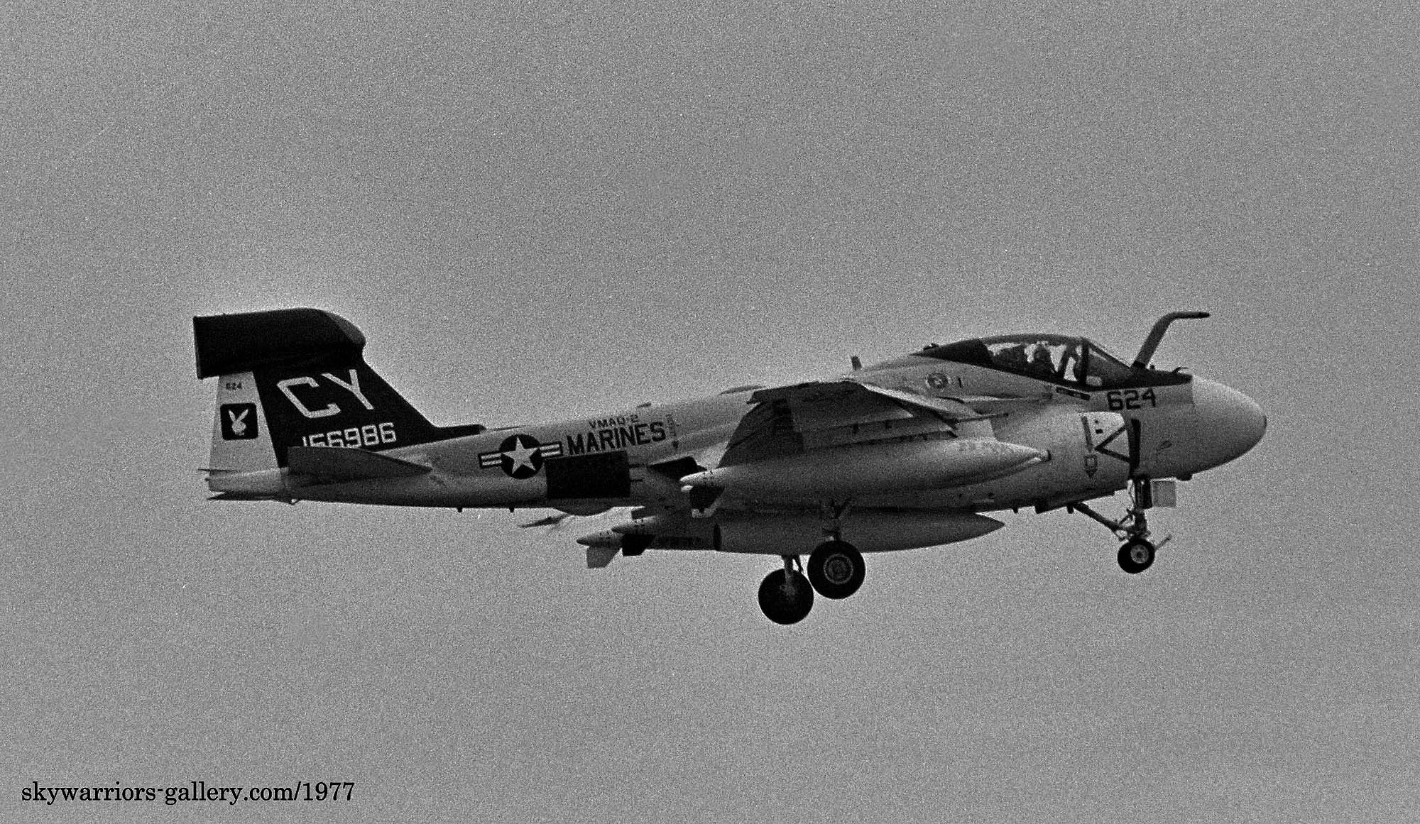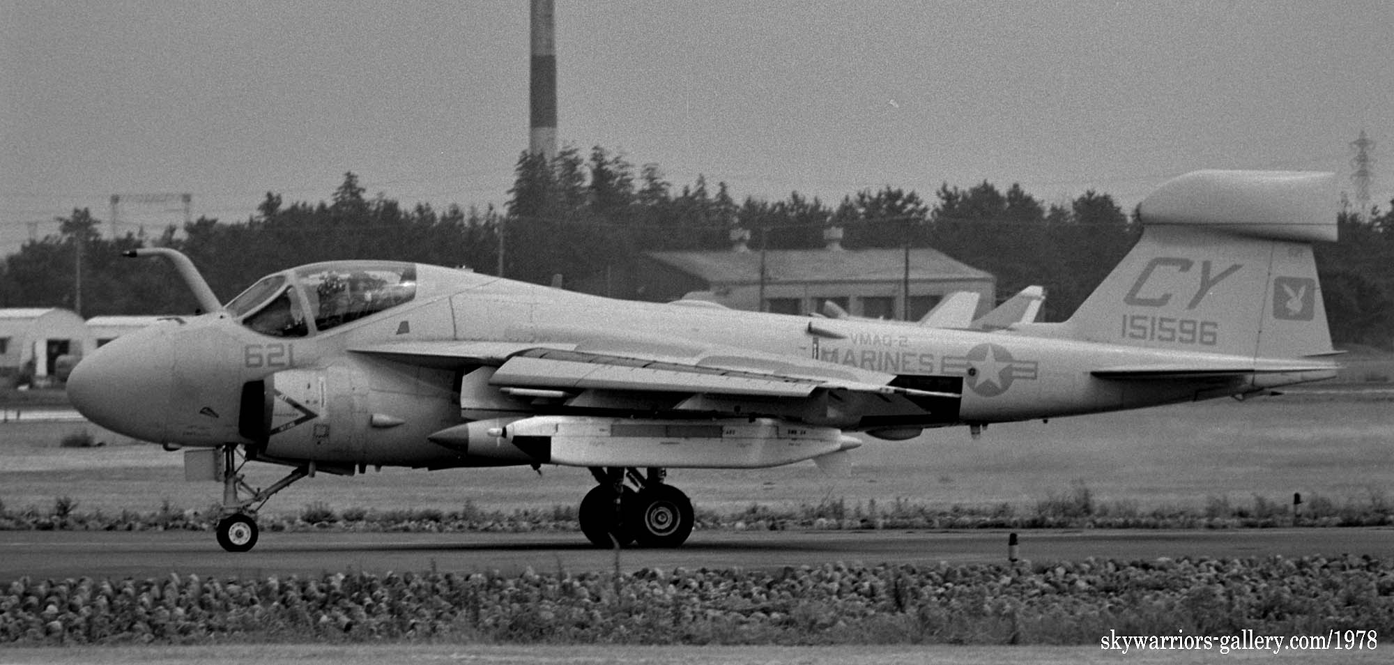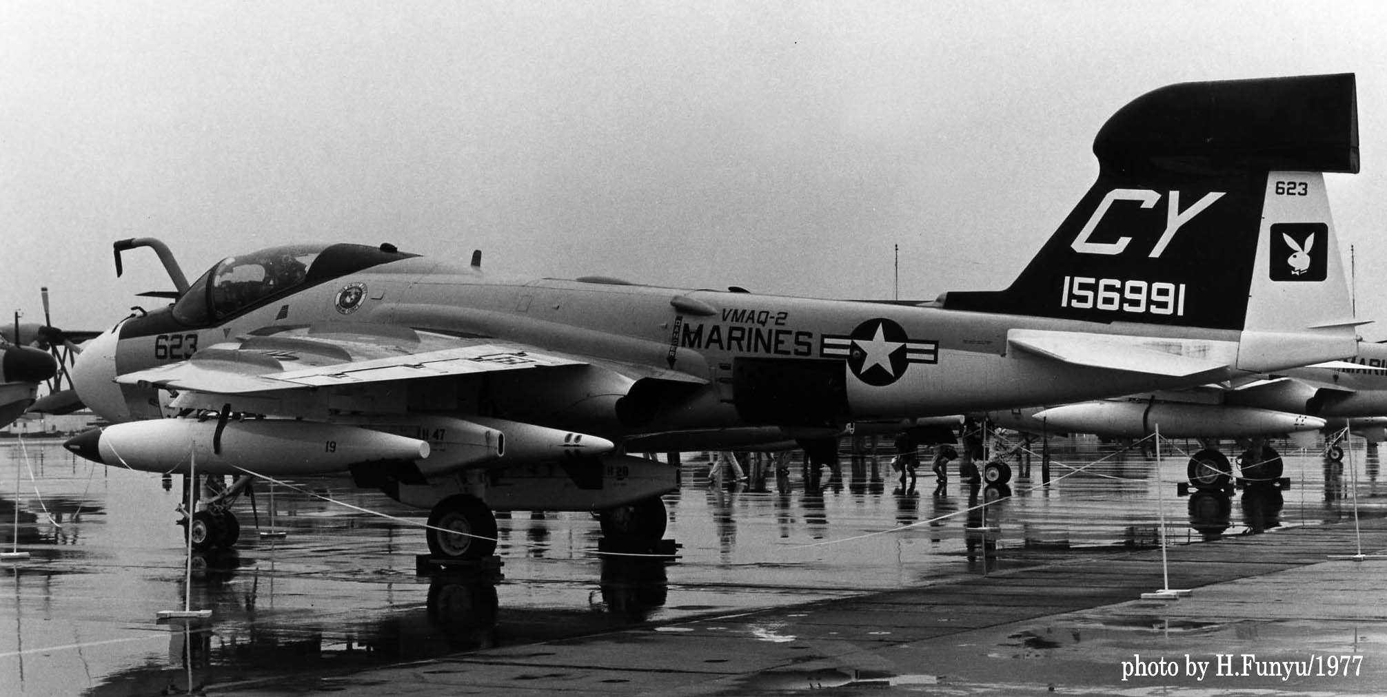 1978年厚木基地で離陸の為 タキシーするVMAQ-2のEA-6A。グレー色だけで仕上げた低視認性塗装(ロービジビリティ・マーキング)であるが、未だこの時期は、他の部隊に普及していたわけではなく 恐らくまだ試験的に施されたものと想像する。尚この部隊が後継機であるEA-6Bプラウラーを使用し始めたときは、再びフルカラーマーキングに戻っている。