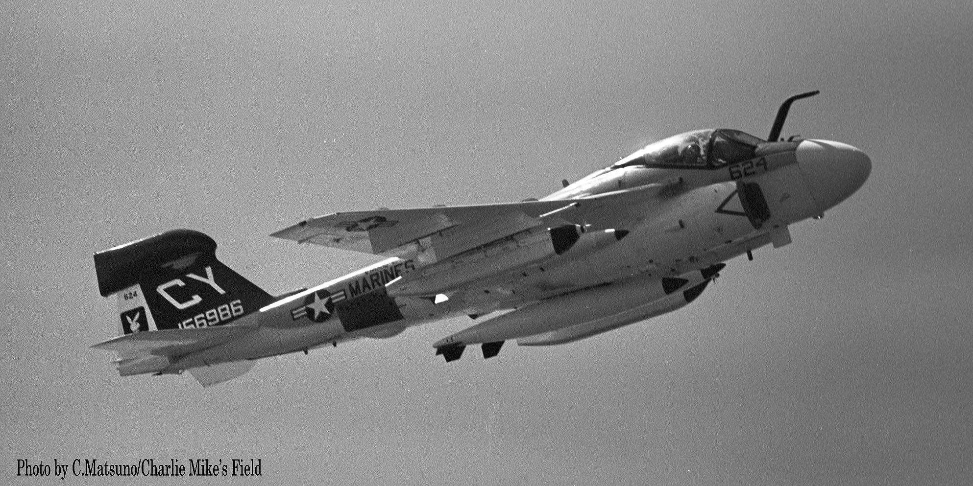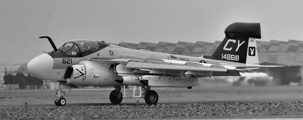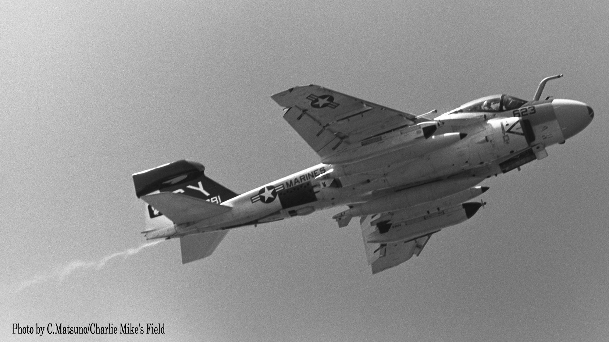 EA-6Aは米海兵航空が最初に手にした電子戦用機である。近接支援任務において敵レーダーの攪乱をする事は生き残りに直結する為、1966年秋には早速ベトナム戦に活用し始めていた。翼下に付けている小さな羽の付いたポッドは、ALQ-76と呼ばれるジャミング・ポッドで敵レーダー波の周波数に合わせ対抗する妨害電波を発信する装置。敵レーダー波4周波数に1個が対応するが、EA-6Aは最大5個を携行できた。