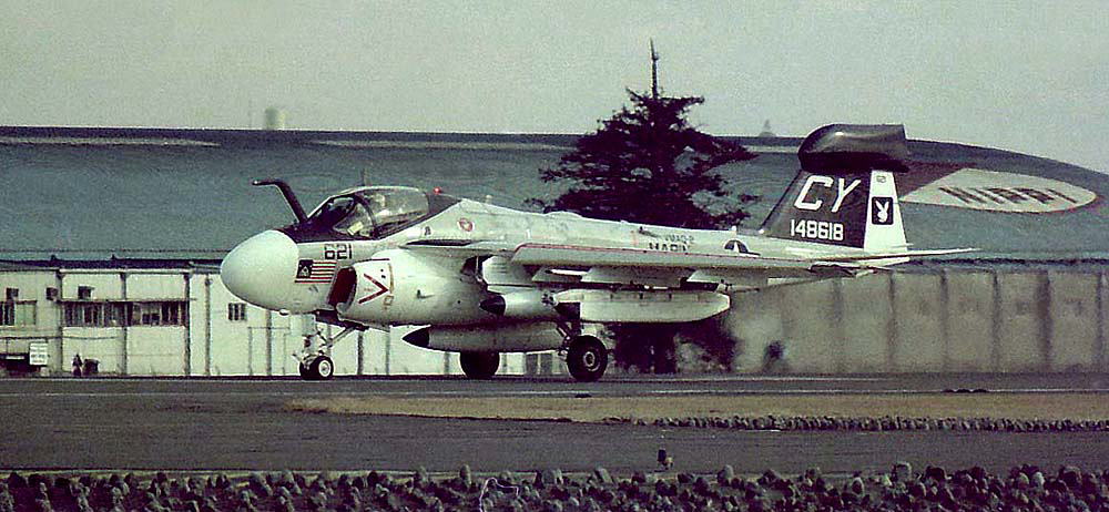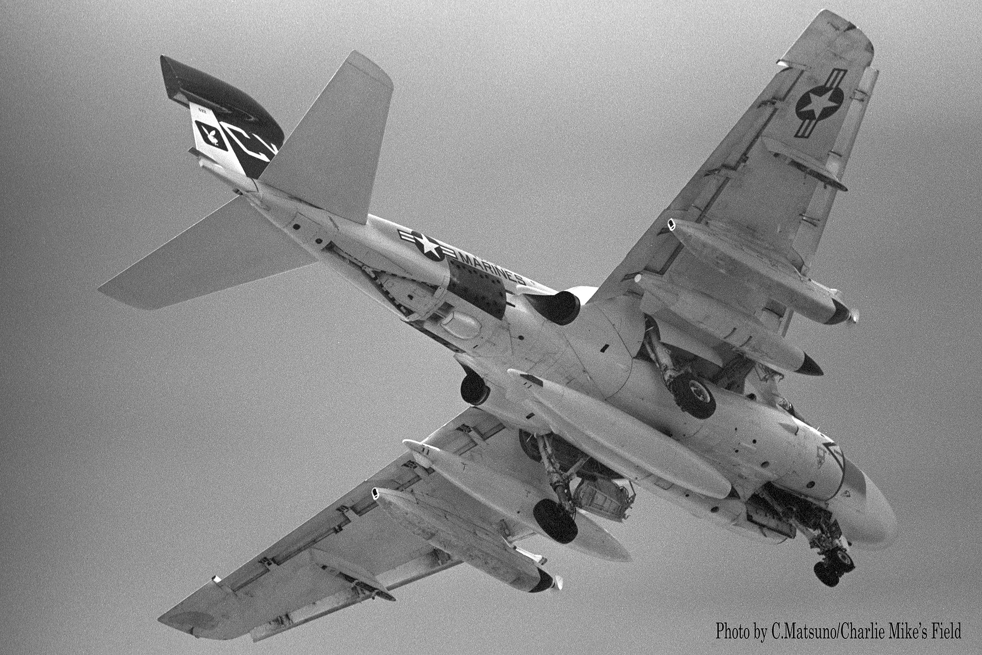 1976年の秋口 夕暮れの厚木基地にランウェイ01で降りて来たVMAQ-2、憧れのEA-6A。建国200年の記念フラッグを機首の左に大きく書き込んでいる。ランウェイのエンドまで転がってくれたので撮影できたラッキーな日であった。私にとってEA-6A(CY)との初対面であった。EA-6Aは海兵隊所属であるが、海軍の空母に積載され海軍機の攻撃任務を電子戦の立場からサポートしていた。電子戦専用機については海兵隊の方が海軍より一早く研究に取り組んだとされる。
