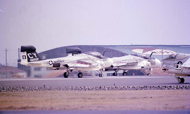 横須賀から空母USS Midwayの出港に伴い その前日に岩国基地から厚木基地入りしたVMAQ-2おEA-6A 3機(CY-621/623/624)は、出港日 CVW-5の各飛行隊とともに 空母に向かった。手前はVA-56のA-7A(NF-413)。EA-6Aは、CVW-5の傘下にあったが、ベースを岩国基地としており 厚木で頻繁に撮影できる存在ではなかったので 1日で3機が同時にランウェイに出て行く姿に マニアも興奮である。