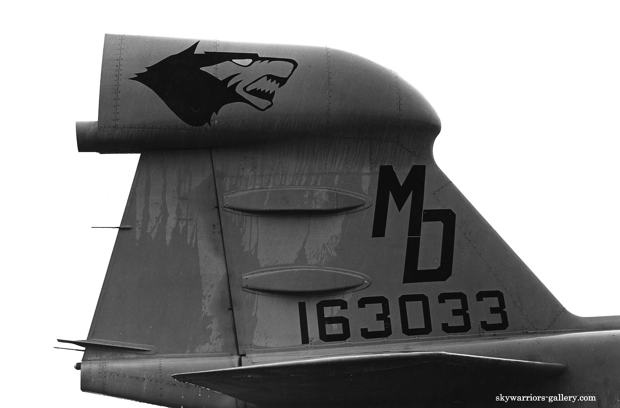 部隊発足から間もない時期に塗装されたもので オール単色グレーのプラウラー。尾翼のムーンドックの目は赤であり この時期は、機体Modexによって目の色を変えていたようである。部隊創設時に決められたテールレター「MD」のデザインは、部隊解散までの間変えられずに踏襲されている。EA-6B Bu.No.158035