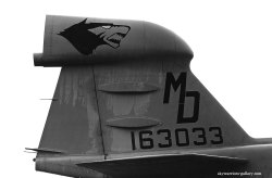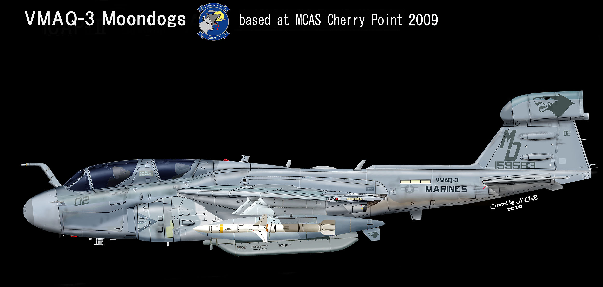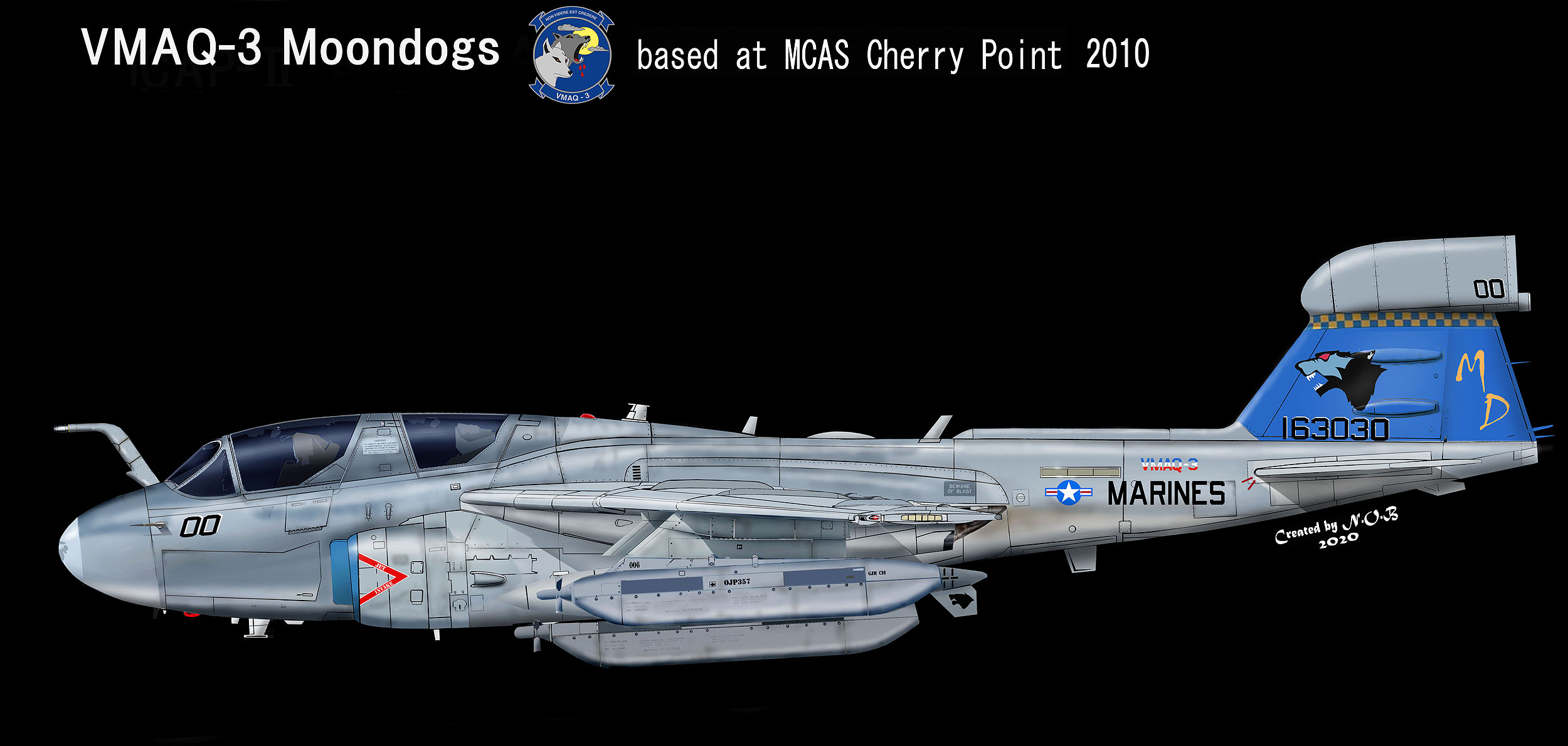 2009年確認されたムーンドッグの黒目(紺)タイプ。あまりマーキングに変化のないこの部隊では、時々色付けされる目の色だけが、話題であったが、黒目は、2004年に確認されたMD-02 Bu.No.161532とこの機体を除いてあまり見かけない。ムーンドッグ以外のマーキング類は、すべてロービジ仕様である。EA-6B Bu.No.158593