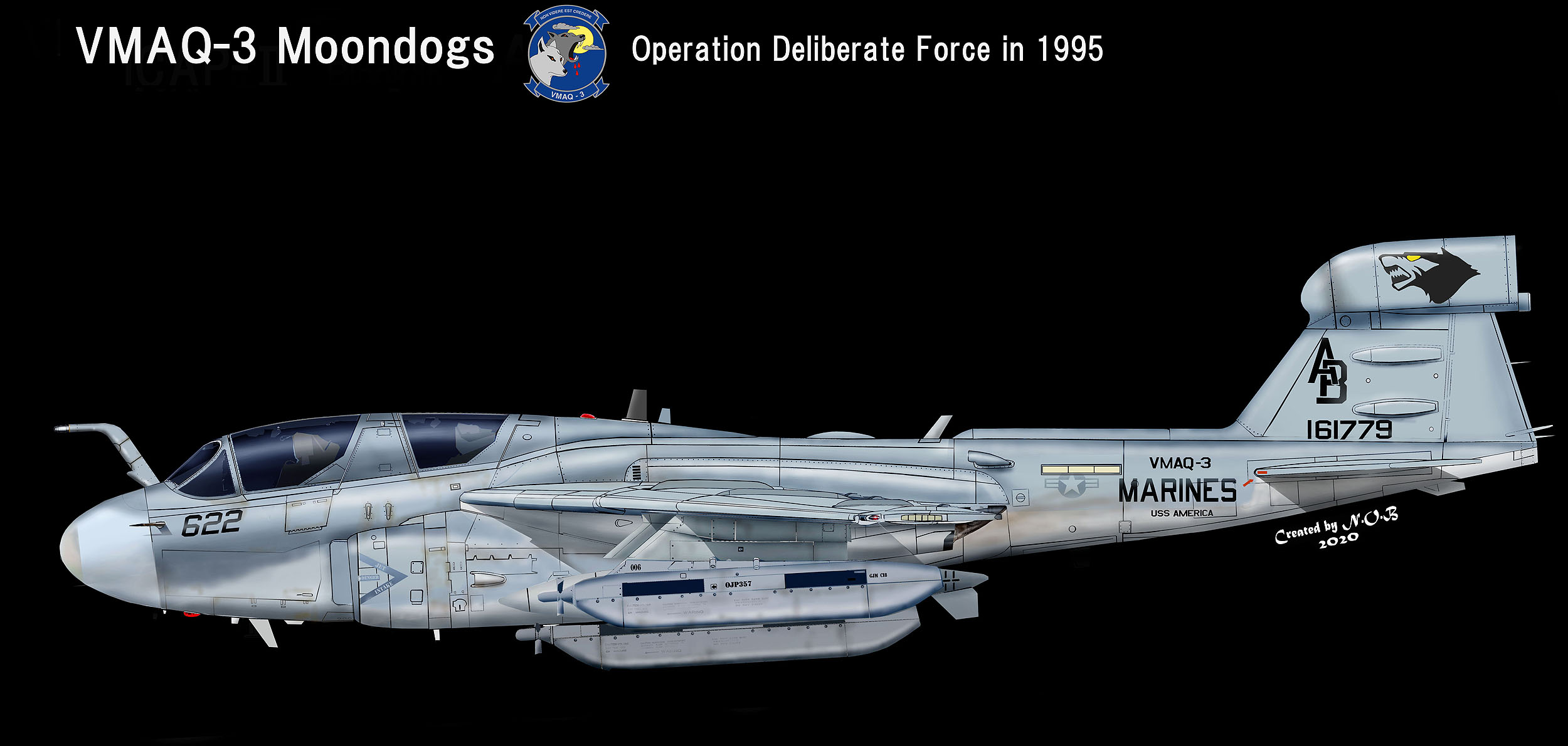 1995年空母アメリカのCVW-1に配属されて航海に出た時のマーキングで プラウラーの部隊としては珍しくテールレターをCVW-1のもの書き換えている。1992年から1995年までバルカン半島をめぐるボスニア・ヘルツェゴビナの紛争で発令された周辺の警戒とユーゴスラビアに対する牽制のため VMAQ-3の部隊も参加している。この時のムーンドッグの目はすべて赤色で統一、何故かこの機体は黄色であった。EA-6B Bu.No.161779