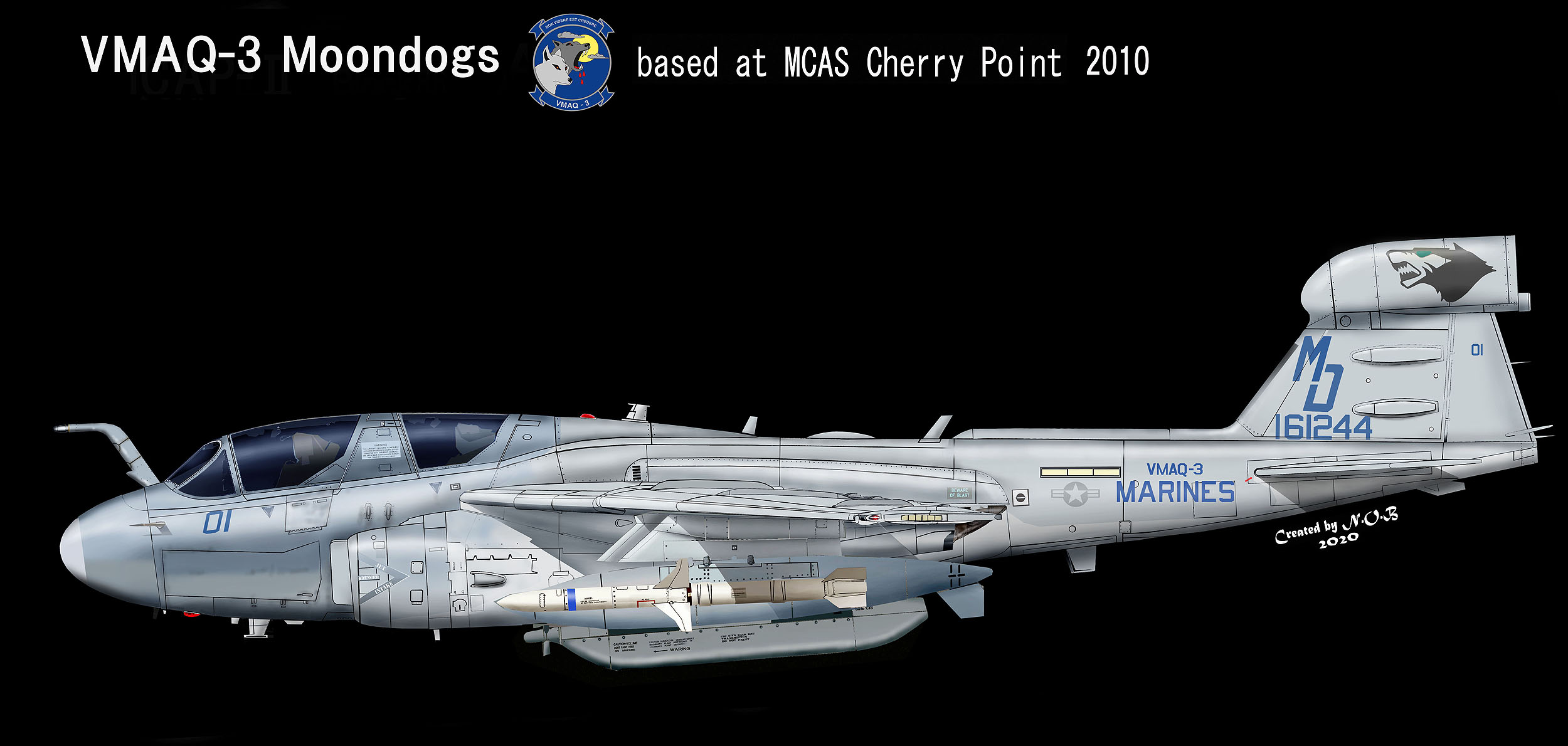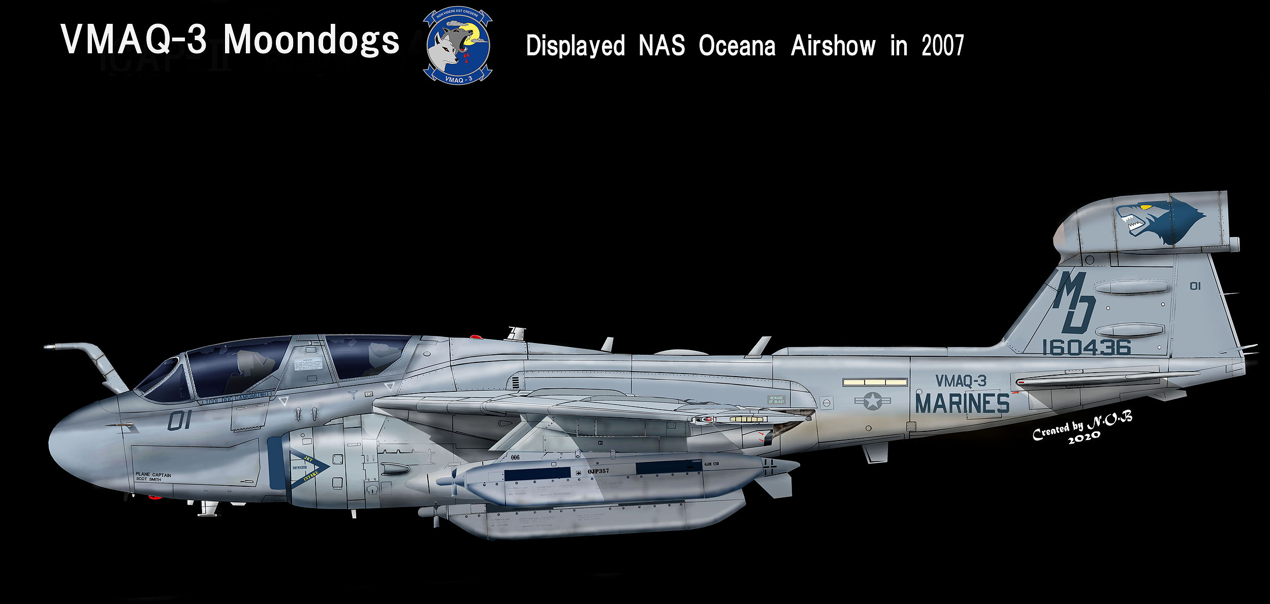 2007年時期のMD-01のマーキングであるが、ムーンドッグの目は黄色いのと牙を白くしてアクセントをつけている。注意書き部隊表記が青みがかったグレーで統一されており 人気の高かったマーキングであった。2007年NASオシアナのオープンハウスに展示されている。EA-6B Bu.No.160436