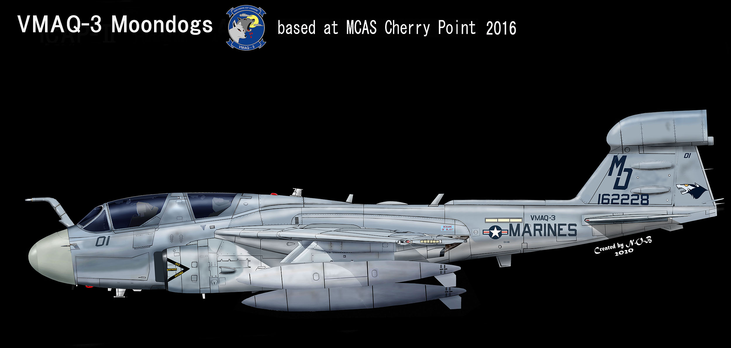 2016年のMD-01のマーキング、尾翼のラダーに移動したムーンドッグの顔が、従来書かれていたものと異なり 多少貧相な顔に見える。しかし インテークや部隊ナンバーなどが、黒に近い紺色で統一されアクセントが付いた。EA-6B BU.No.162228
