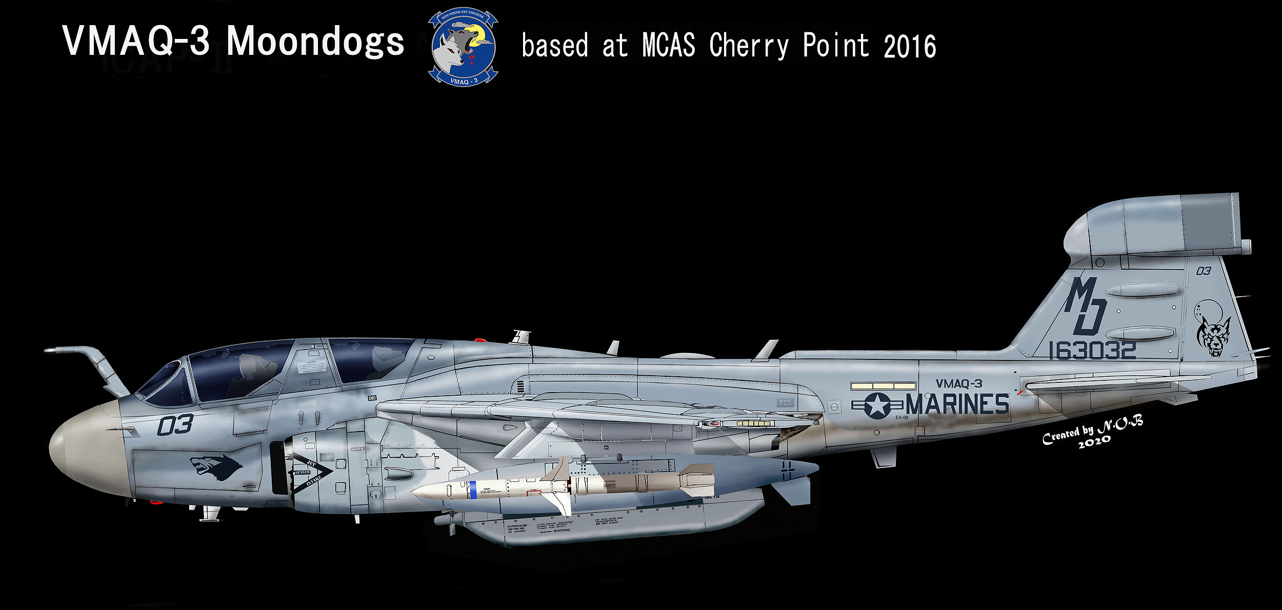 2016年に確認されたMD-03のマーキング、従来の部隊マーク ムーンドッグの顔が機首に移動し 新たに満月と吠える犬の絵柄が、ラダーに書き込まれている。Bu.No.163032