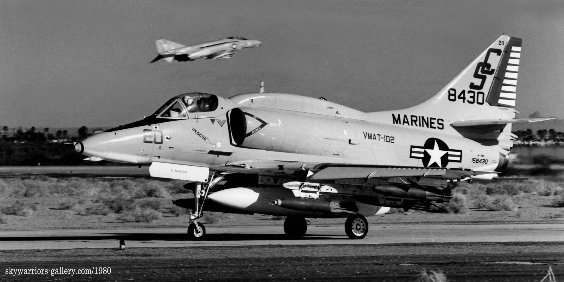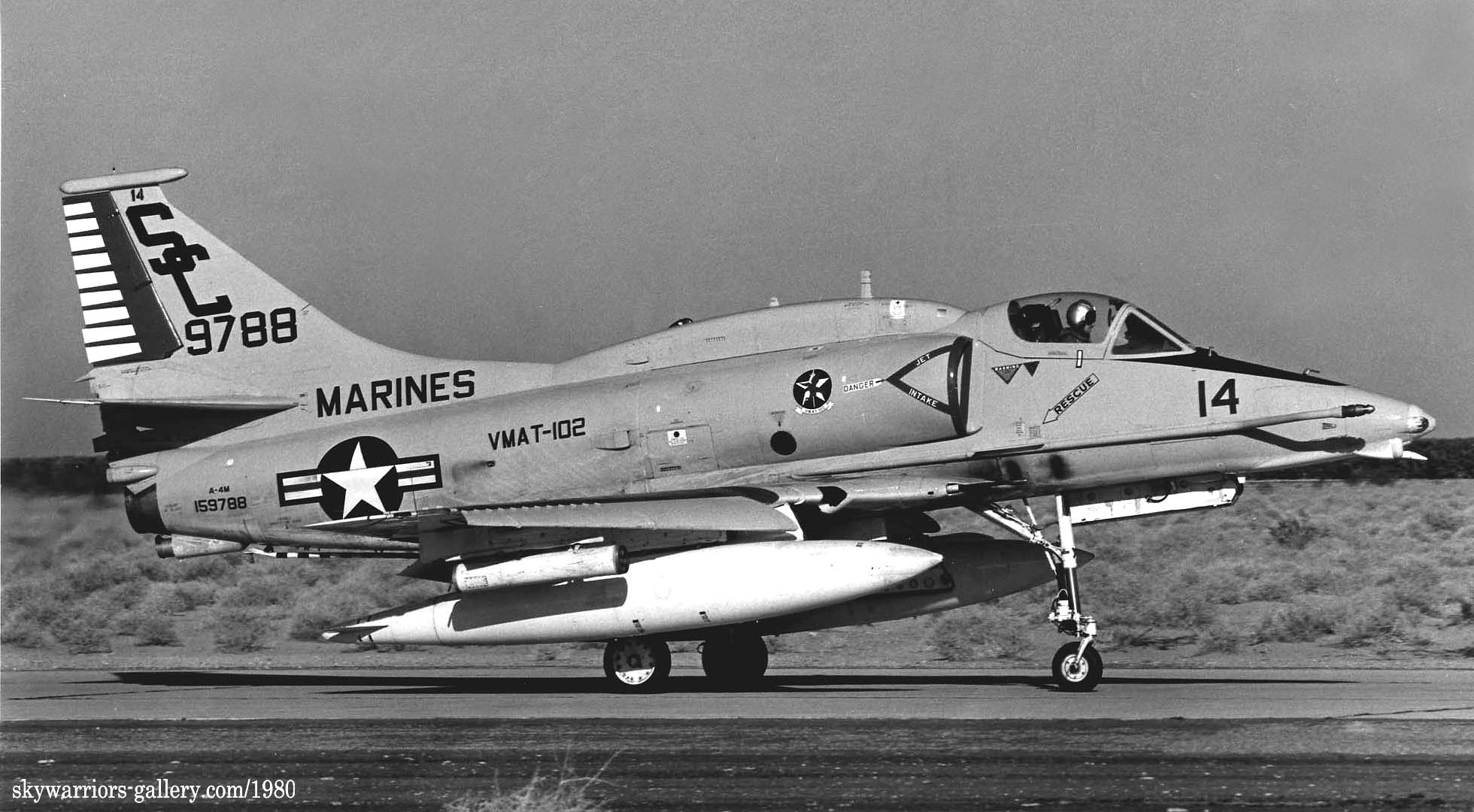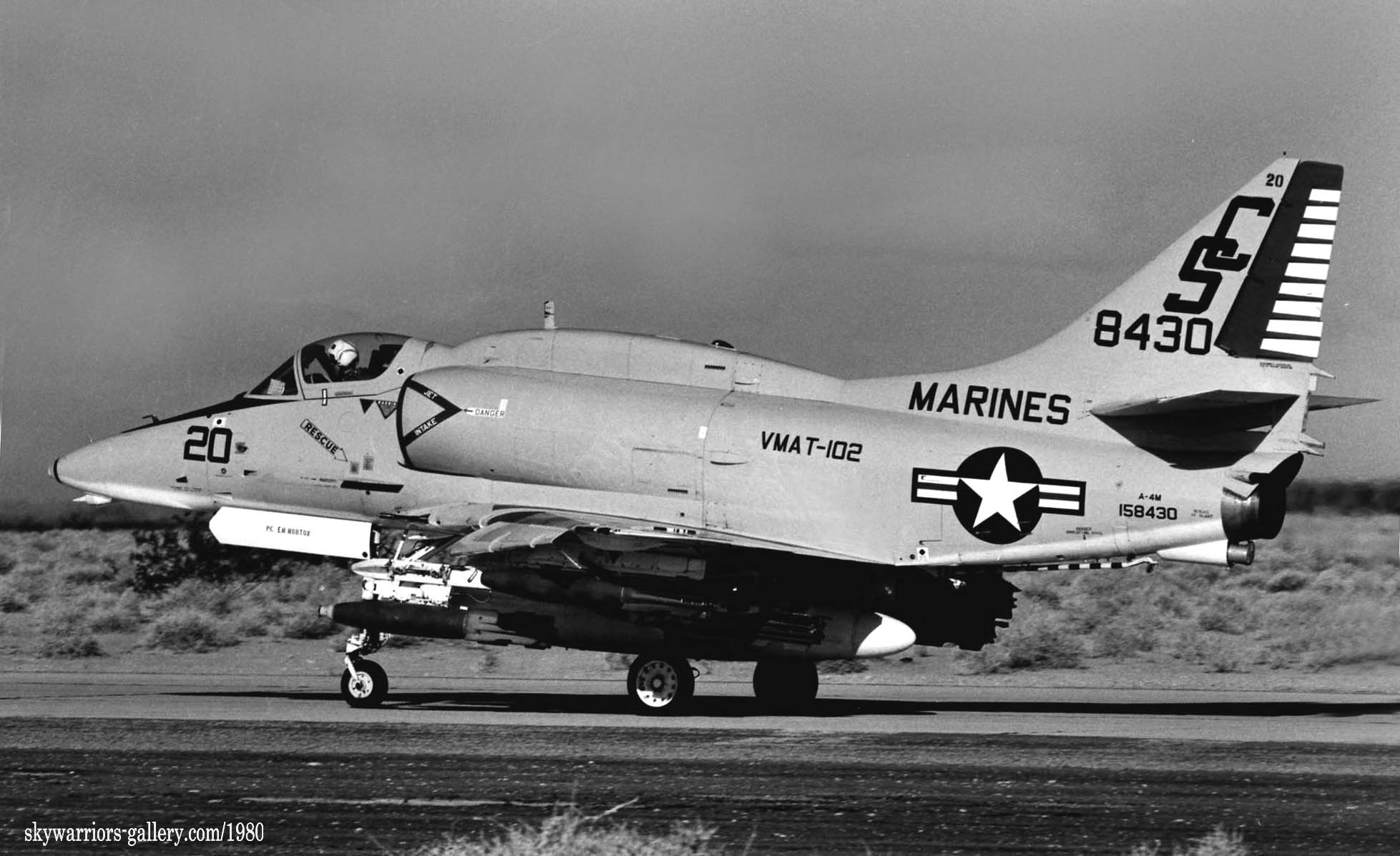 VMAT-102については、飛行隊の資料に乏しく、詳しい知識も無いのだが、1980年当時海兵隊航空部隊の中で当時F-4への転換訓練に担当していたのがVMFAT-101であったのに対し、海兵隊パイロットのA-4の訓練を一手に受持っていたのが、このVMAT-102”HAWKS"だったそうだ。共にMCASユマを本拠地とし訓練部隊としてかなり多くの機体を所有していたようだ。VMAT-102のマーキングで特に有名なのが、A-4の胴体側面に真っ赤な鷹を大きく書き込んだデザインの機体で、よく航空専門誌にも掲載されたが1980年以降は下に並べた写真の簡素化されたマーキングとなっていた。