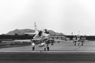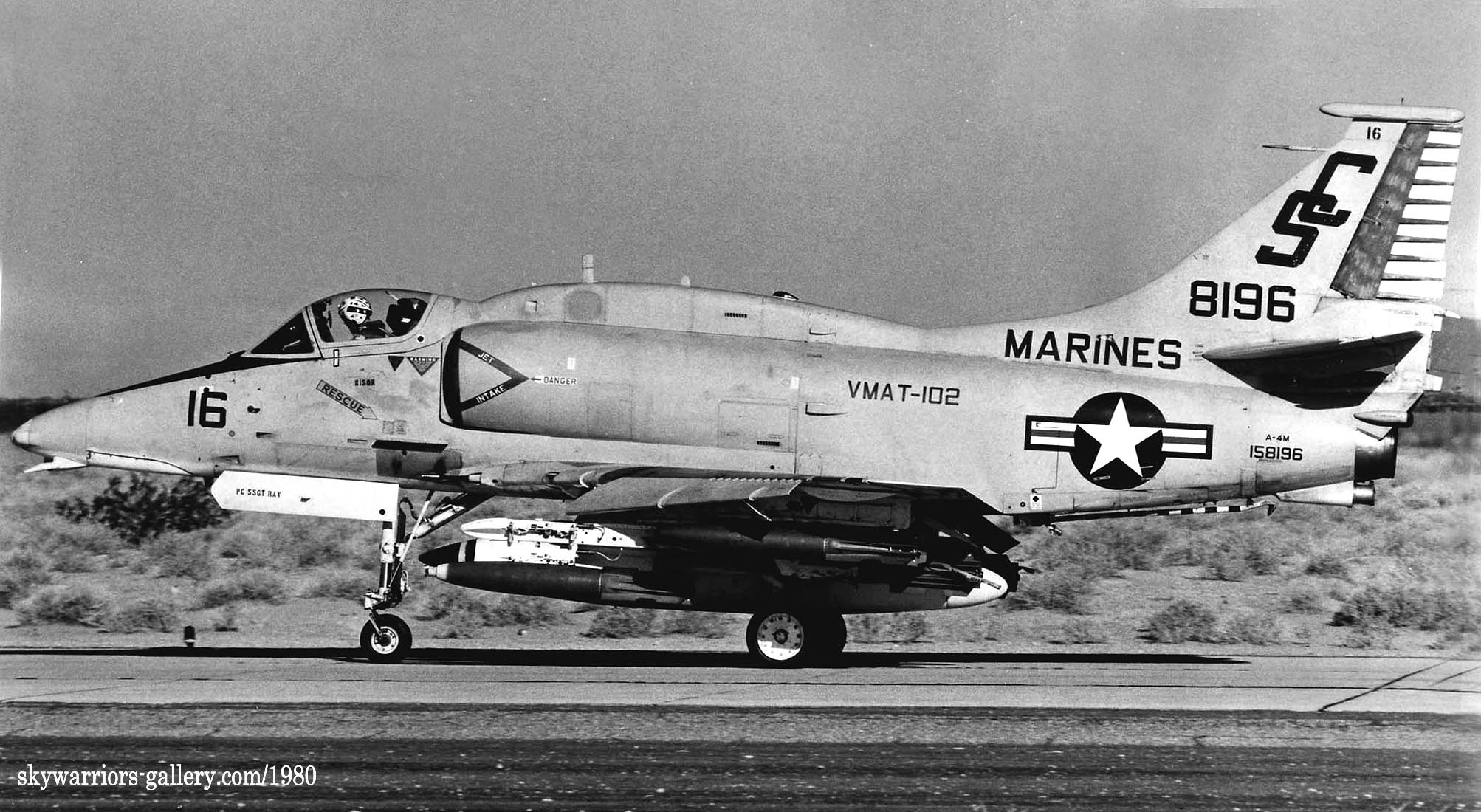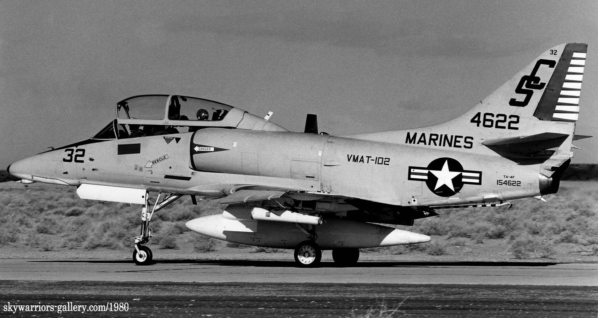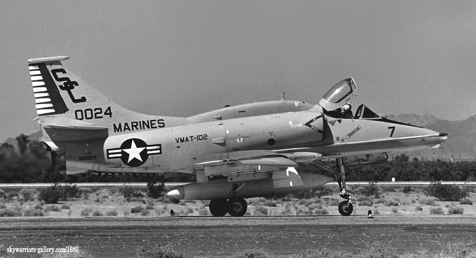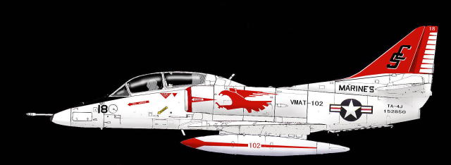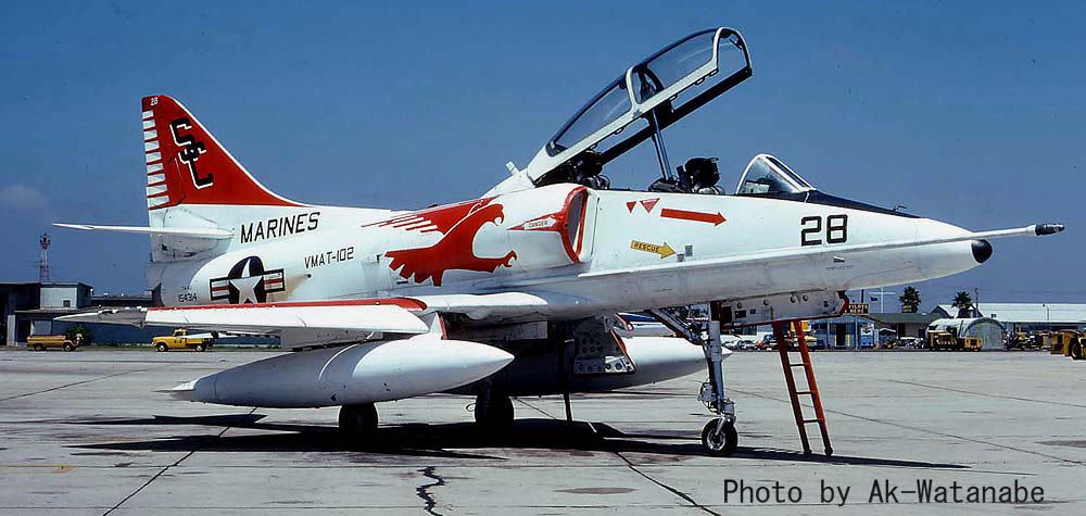 ”ファントムの隣には、いま少し前ミラマーに着いたSHのレターコードを付けたVMFAT-101のF-4Jが並んでいる。その近くにはやはりアリゾナ州ユマから飛来したVMAT-102(SC)のTA-4Jが翼を休めている。真白な胴体に大きな赤いワシのマーキングを付けた大変美しい機体だ。その隣にはVA-127のTA-4Jが並んでいる”・・・・航空情報 1977年3月号記事