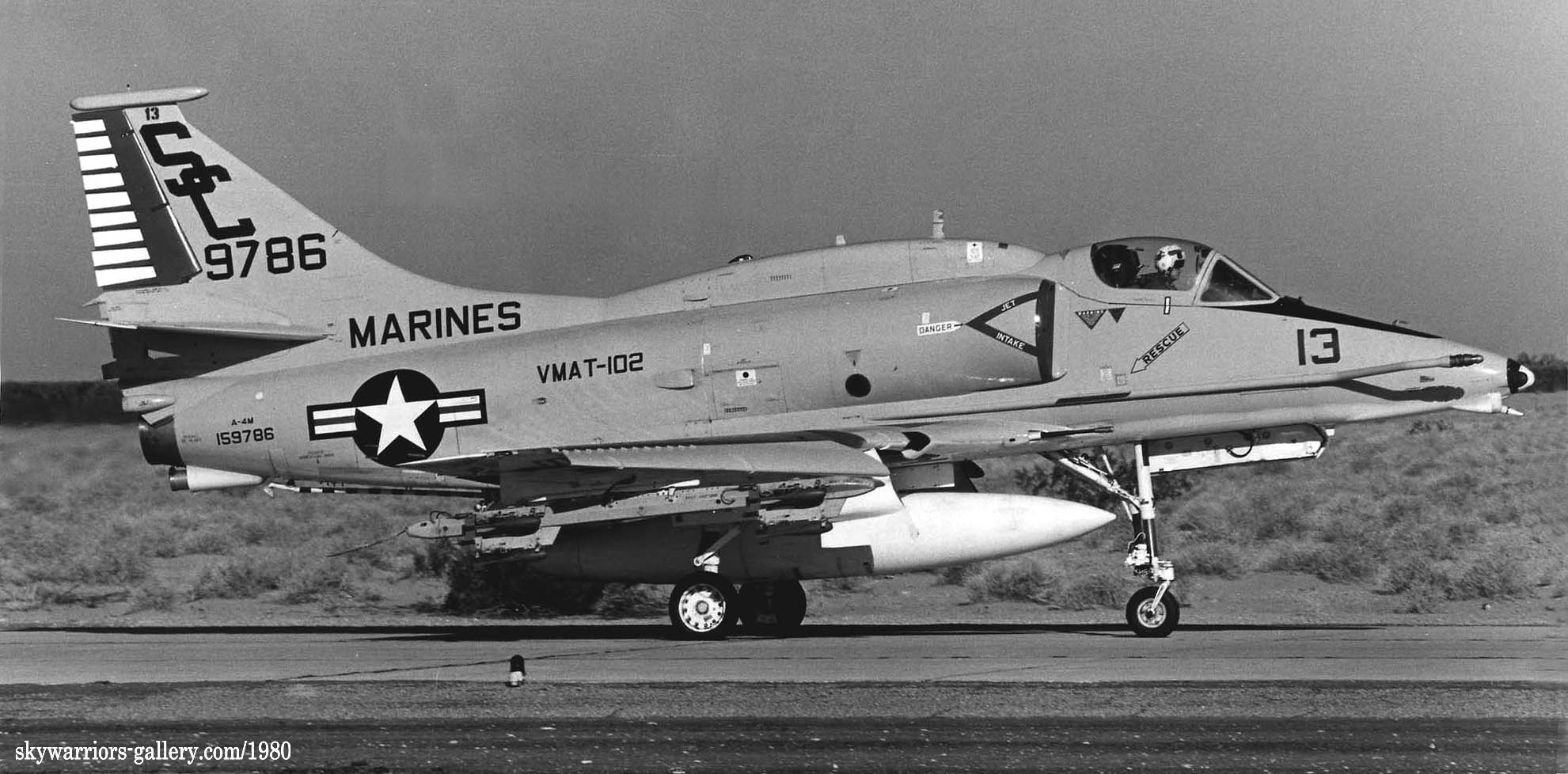 VMAT-102は1969年1月設立の部隊で、当初はA-4Cを受領してスカイホークへの転換訓練・攻撃訓練を担当いた。しかし この部隊の任務はこれだけではなく、地上要員のメンテナンス技術サポート、偵察写真撮影装置の装着運用訓練、ヘリコプターのサポート任務など多様であったようだ。1970年にA-4E/TA-4Jを受領し1973年にA-4Fに機種変更している。1973年に40000時間の無事故飛行記録を達成と記録されている。