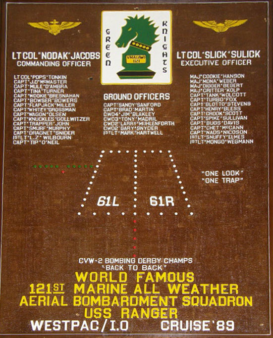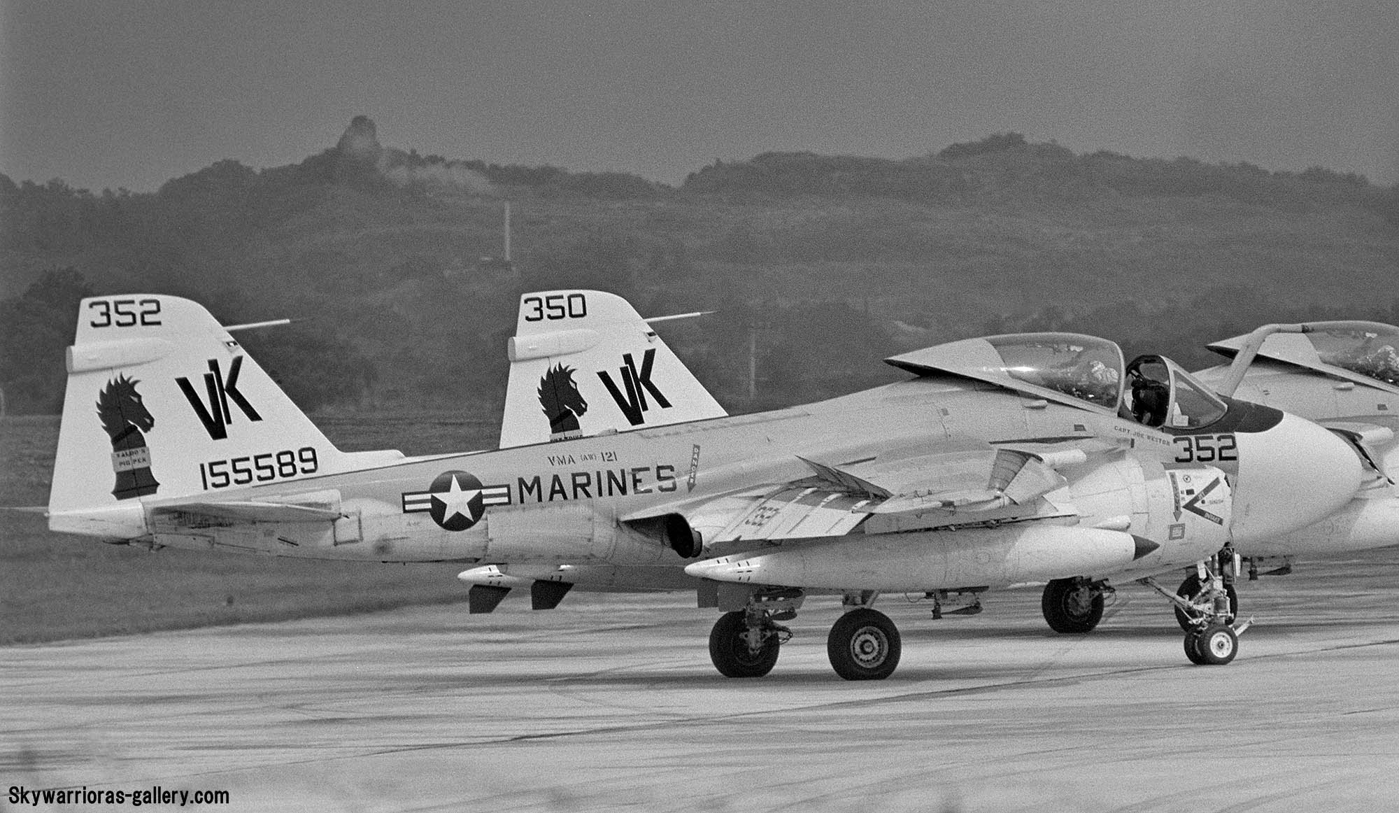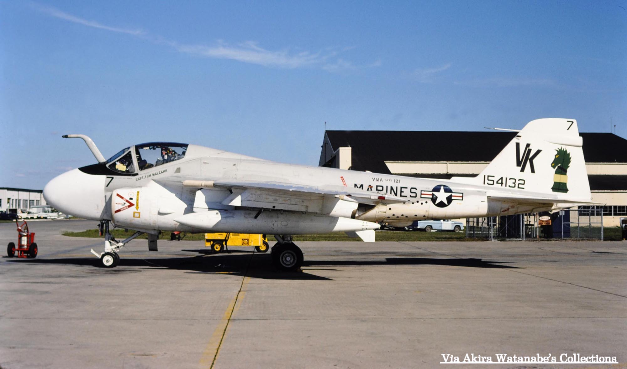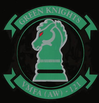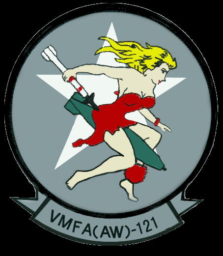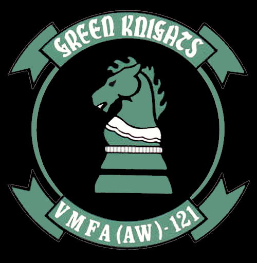 VMA(AW)-121グリーンナイツは、太平洋戦争勃発の半年前である1941年6月にVMF-121として誕生している。1941年の6月は、ドイツ軍ソ連侵攻のバロバロッサ作戦が開始された月である。同年12月に、日本海軍は真珠湾を奇襲しているので、正に大戦に向けて創設された飛行隊になってしまった。F4Fワイルドキャットの配備を受けて太平洋戦争中はガダルカナル島を中心に、ソロモン諸島方面の防衛と日本に対する艦船攻撃に際し 攻撃隊の護衛任務を行った。この間 戦闘機部隊として14人のエースを輩出するなど多くの戦果を上げたと言われている。米軍のぺリリュー島占領後は、そこを拠点として活動している。A-4スカイホークを使用後、1969年に全天候型攻撃機A-6イントルーダー攻撃機を受領し、部隊名もVMA(AW)-121となった。A-6Eになって岩国に配備されたのは1976年の5月で、尾翼にアメリカ建国200周年記念の帯を入れた派手な姿で我々を楽しませてくれたが、1976年末までにはこの帯は消されてしまった。1989年12月FA-18Dを受領し、VMFA(AW)-121に部隊ナンバーが変更されている。