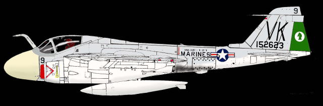 上の図は、A-6Aを使用していた時代のマーキングで グリーン・ナイツのネーミングの通り チェスのナイツをラダーに書き込んでいた。1977年岩国に飛来した時は、全機 国旗を模したバイセンティニアル・マーキングであったが、すぐに消され 下図のようなマーキングになっている。チェスのナイツはよりリアルになって大きく書かれるようになった。