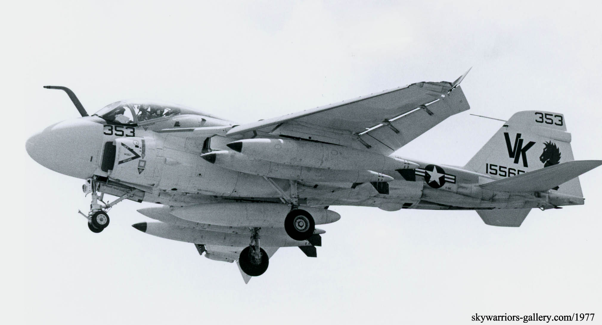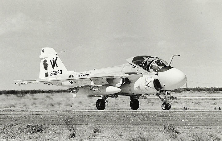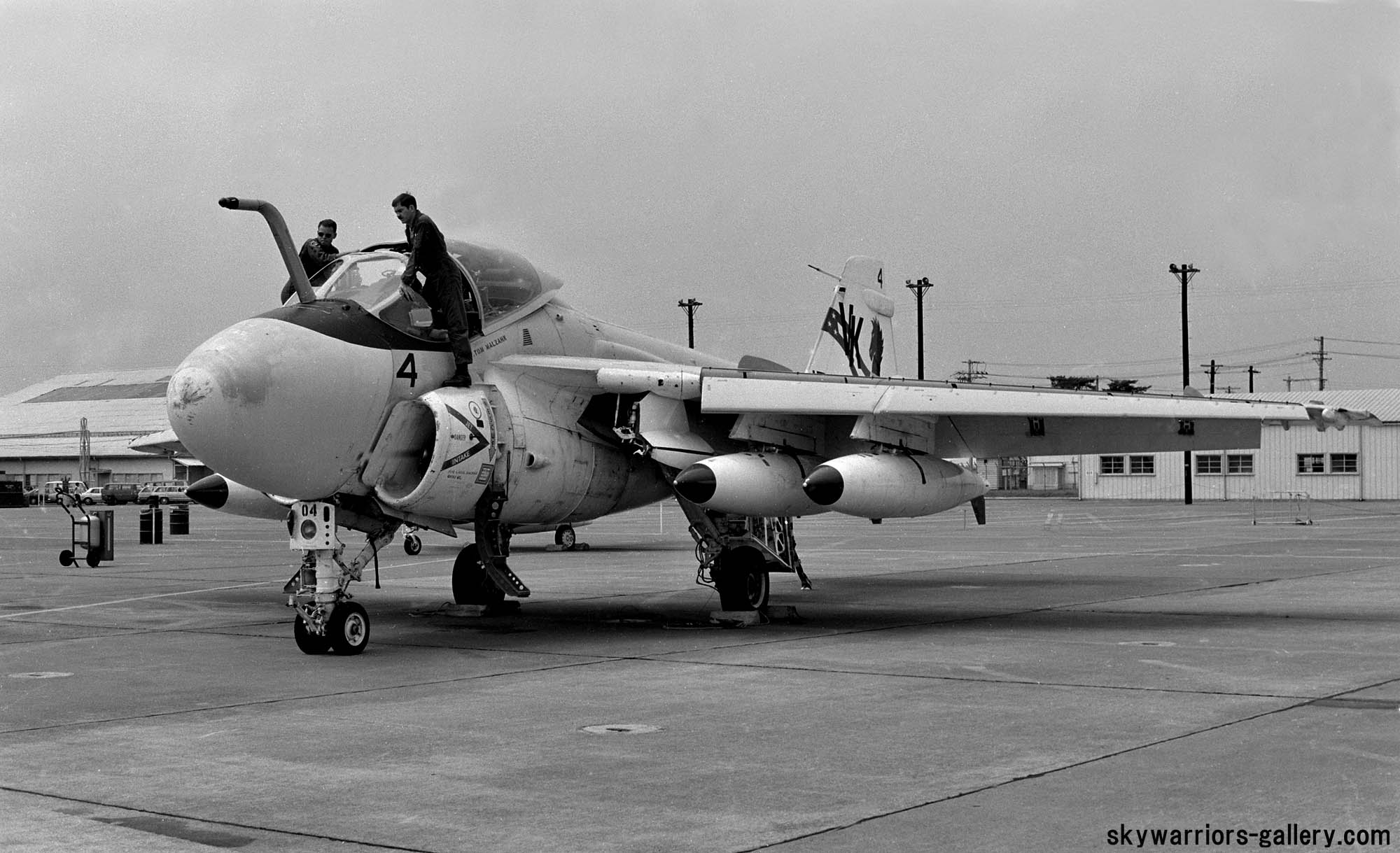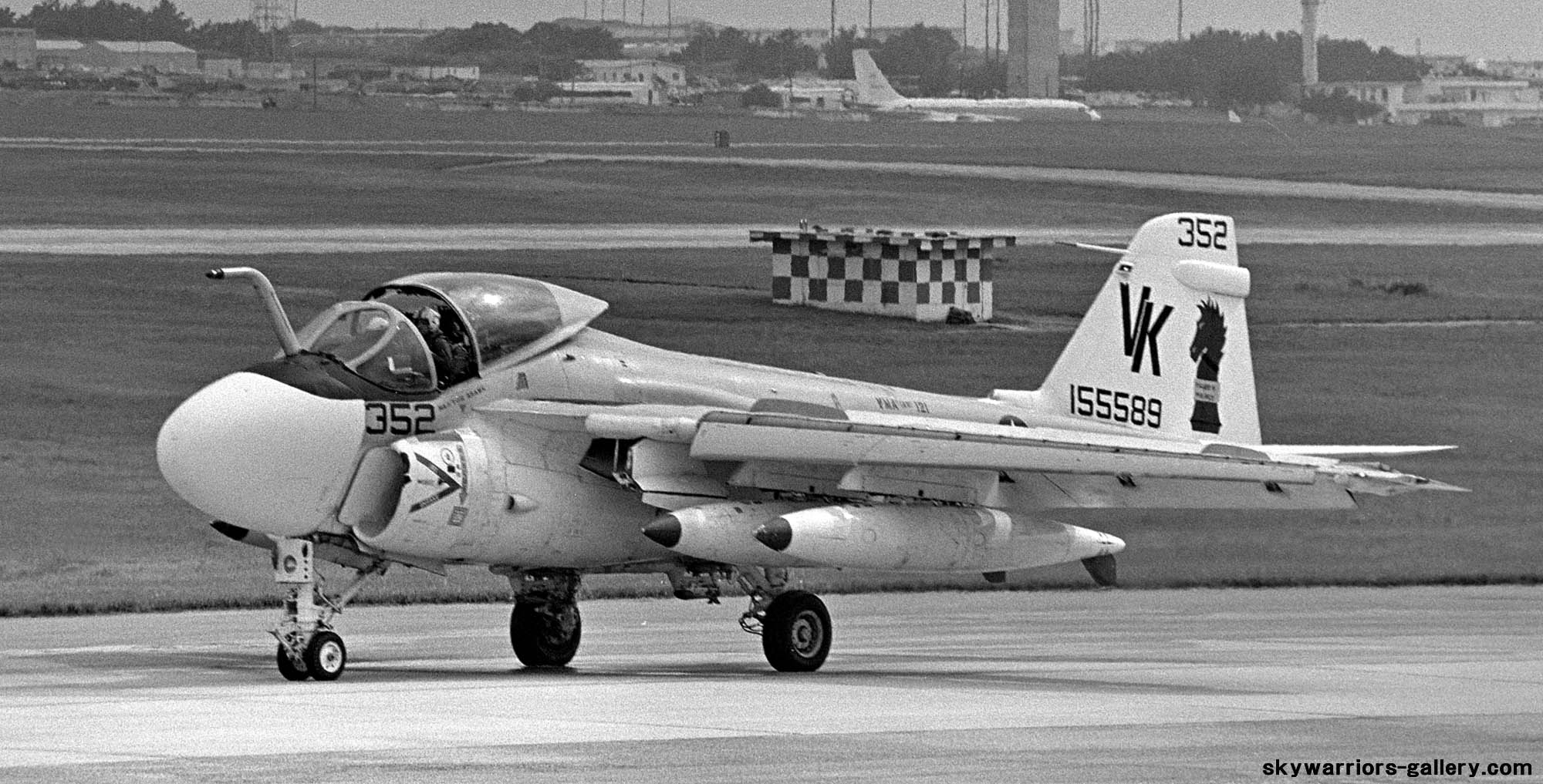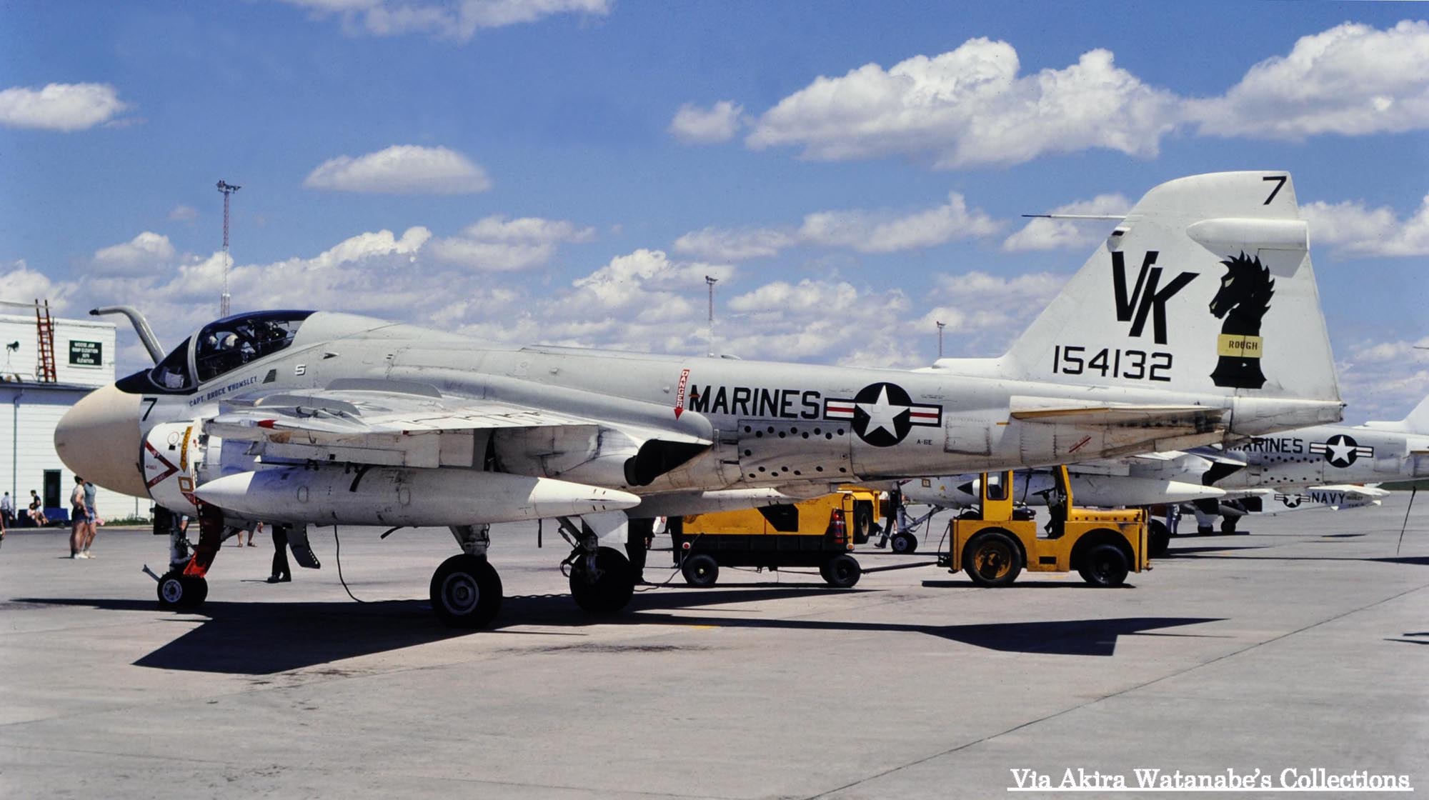 ↑ 一段上の写真と同じVK-7であるが、1979年6月に撮影されたVMA(AW)-121のA-6E/Bu.No.154132。レードームは、クリーム色の標準塗装(と言うより、むしろ原材料そのままの無塗装が正しい)になっている。