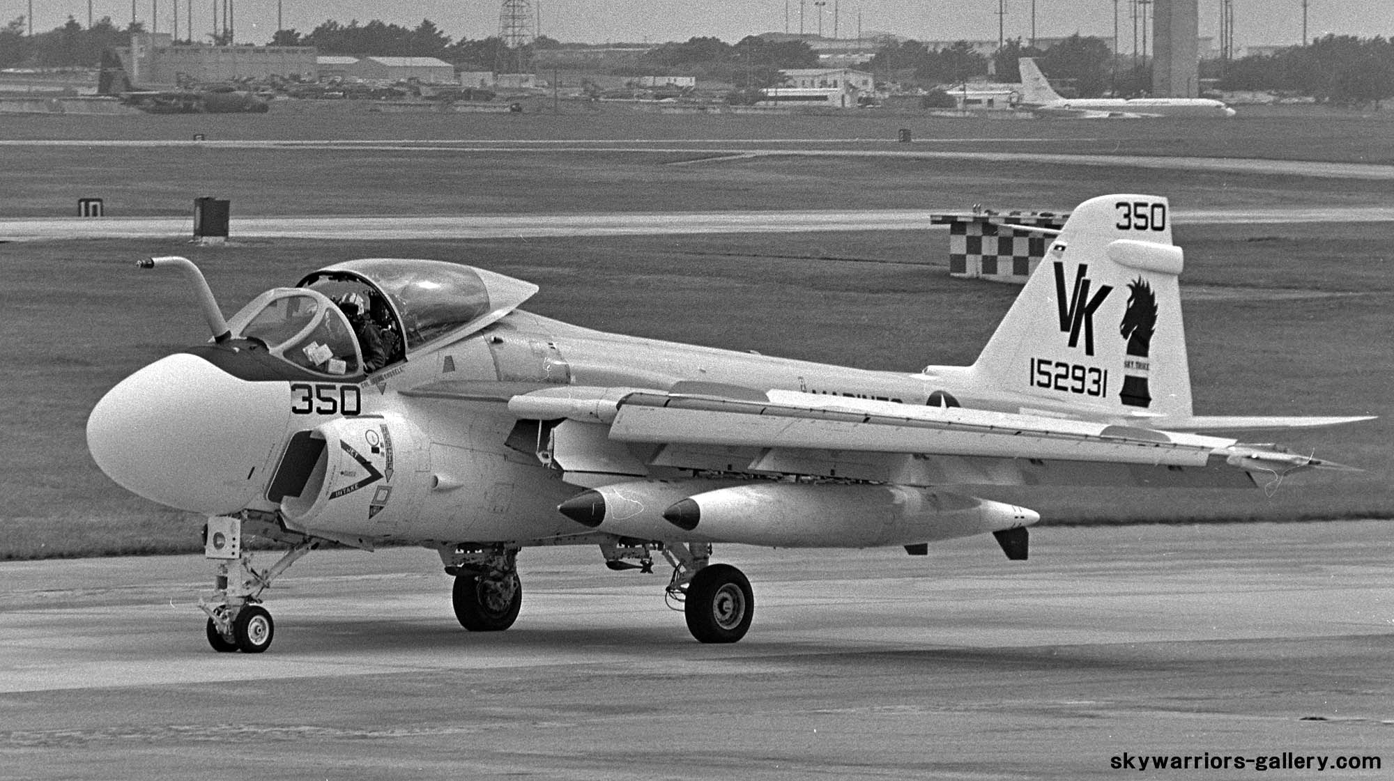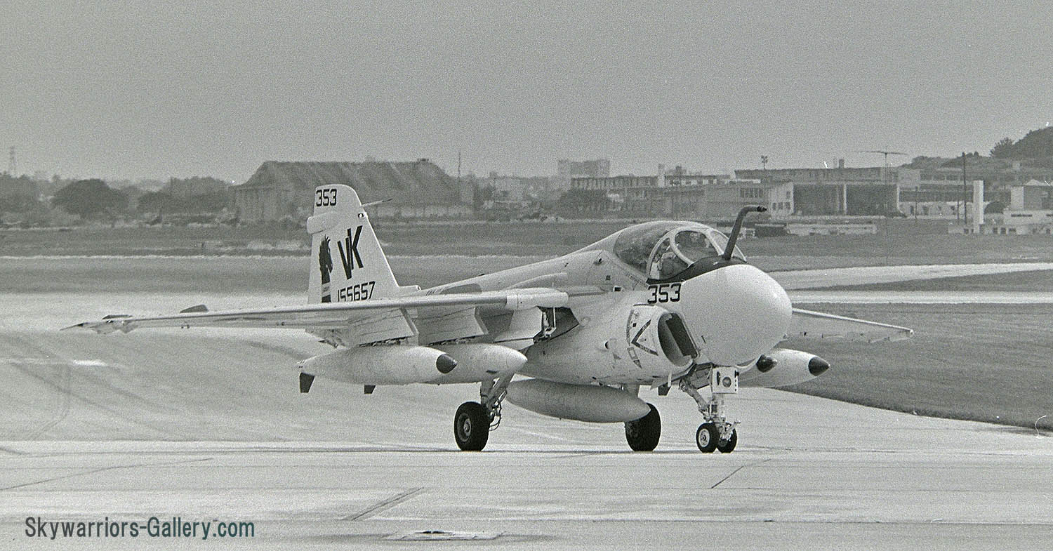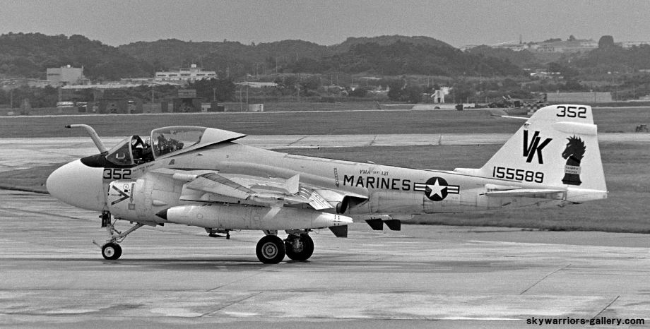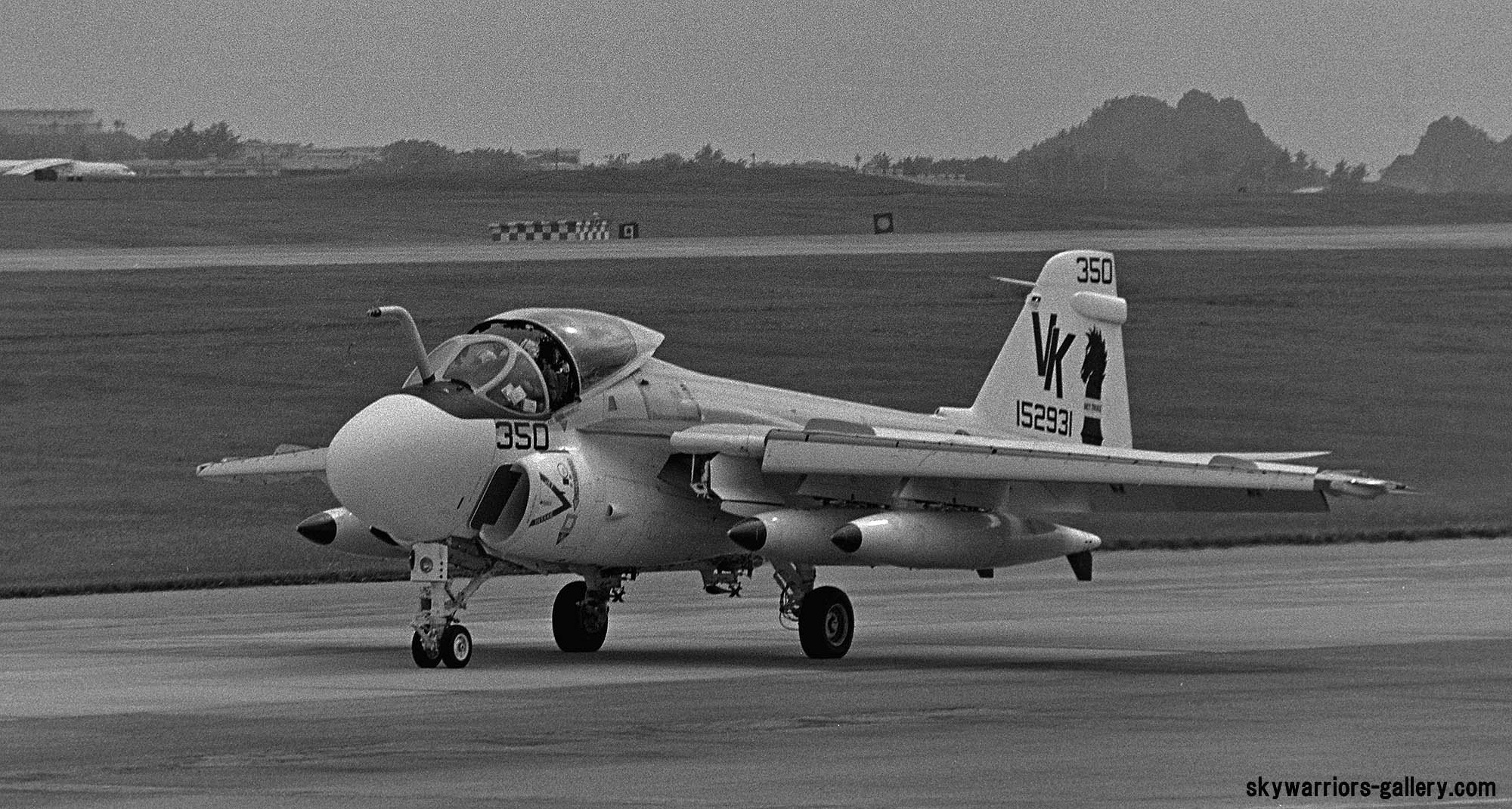 ↑ 1978年3月嘉手納基地をR/W23で離陸の為滑走するVMA(AW)-121のA-6E。空母運用の為、Modexは三桁の350番台。