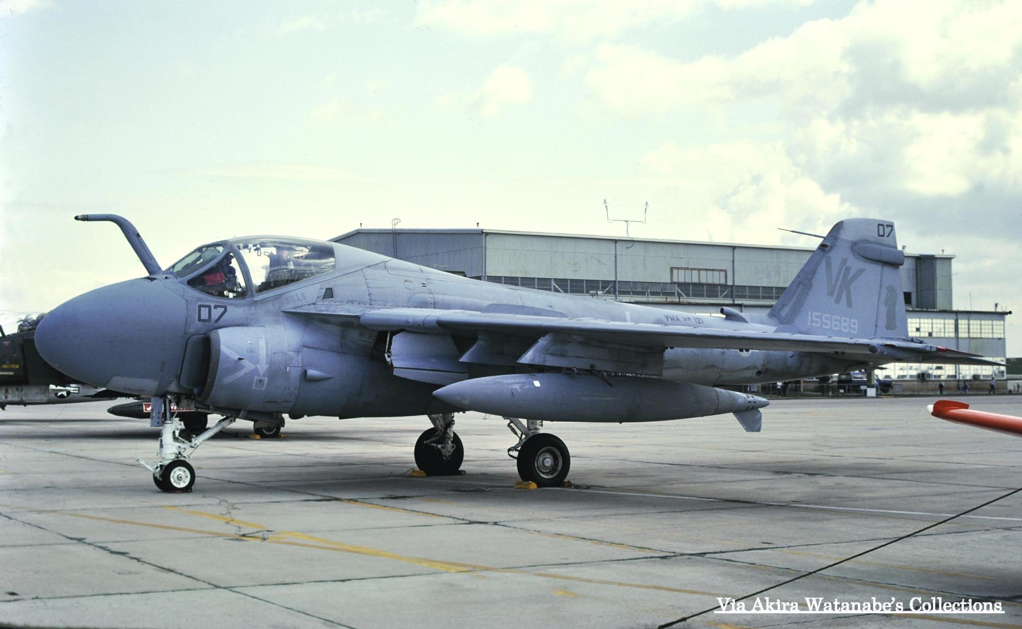 ↑ 1983年4月アメリカ本国で撮影されたVMA(AW)-121のA-6E/Bu.No.155689。すっかりロービジ・スタイルに変更されている。