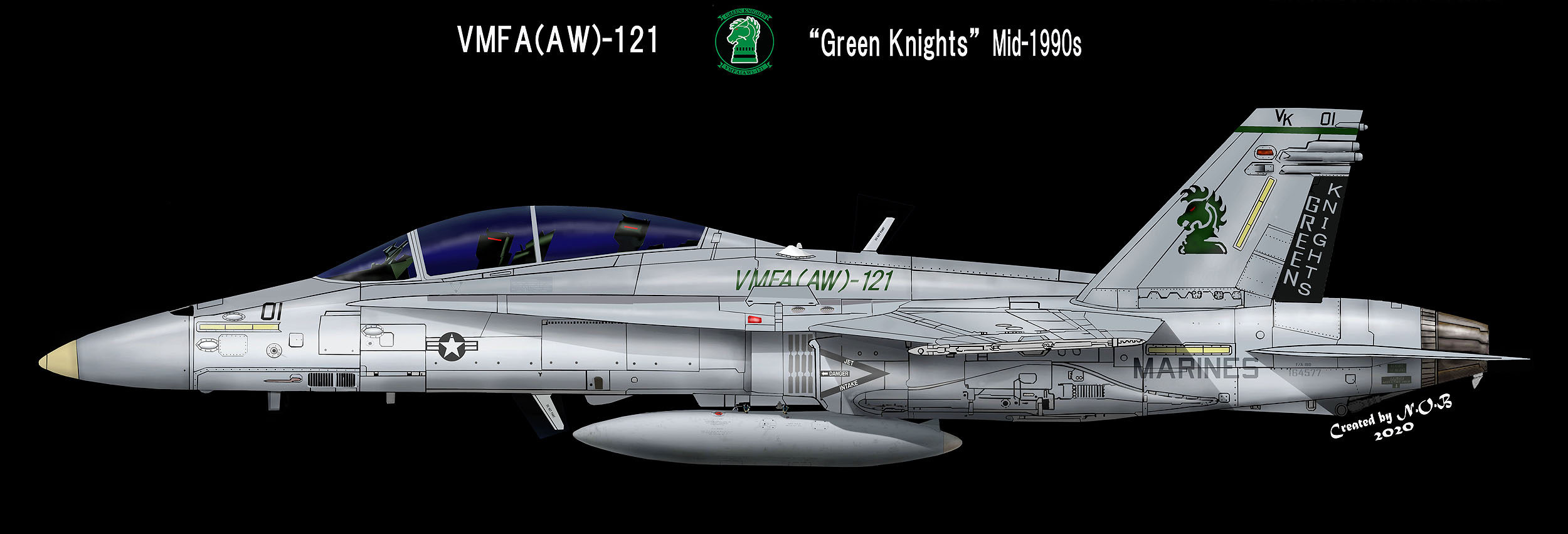 太平洋戦争終了後 しばらく平和な日々が続いてが、1951年1月元旦に突然北朝鮮軍が38度線を越えて南側に侵入、朝鮮戦争が勃発して国連も蜂の巣を突く騒ぎとなった。この年、VMA-121はカルフォルニア州のエルトロ基地で既にスカイレーダー攻撃機の訓練を重ね、朝鮮戦争への出撃準備を整えていた。朝鮮に赴いた彼らの著名な戦果はスイホーダム攻撃任務で、150トン以上の爆弾を叩き込んでいる。朝鮮戦争時代は、部隊ニックネームがコミックのウルフガールを捩りウルフ・レーダースと呼ばれていたらしい。1962年にA-4スカイホークを受領して この頃からグリーンナイツを使い始めたようだベトナム戦にも駆り出され 南ベトナムのチュンライ基地をベースに半年の激戦を戦い抜いた。1969年から前ページでご紹介したA-6イントルーダーを20年間使用し、1989年からF/A-18Dに更新された。。