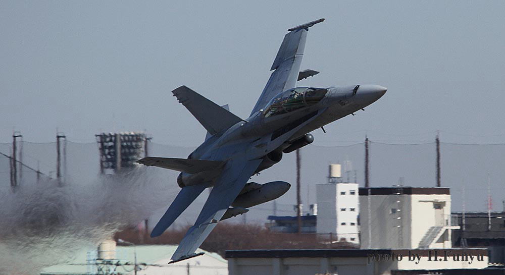 上の写真は、いずれもフニュフニュ君の撮影によるもので 厚木基地のテイクオフを捉えたものである、上の1枚はR/W19 16:11の離陸 さすがに2月の午後4時過ぎともなると日が傾くため夕日を浴びているが、嘉手納基地と違い比較的機体の離陸高度が低い・・・・・嘉手納の場合は、滑走路が長いためと離陸の撮影ポイントがランウェイエンドから離れすぎていて、離陸後、航空機が充分高度をとってしまう為、撮影条件が厳しいのである。