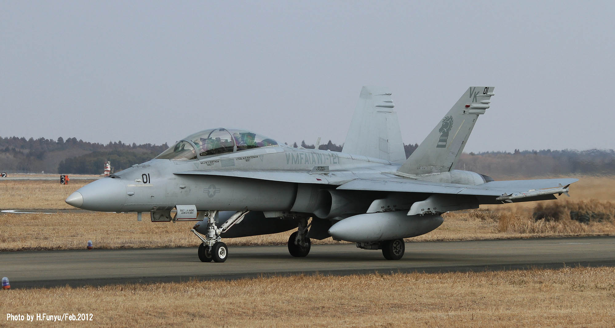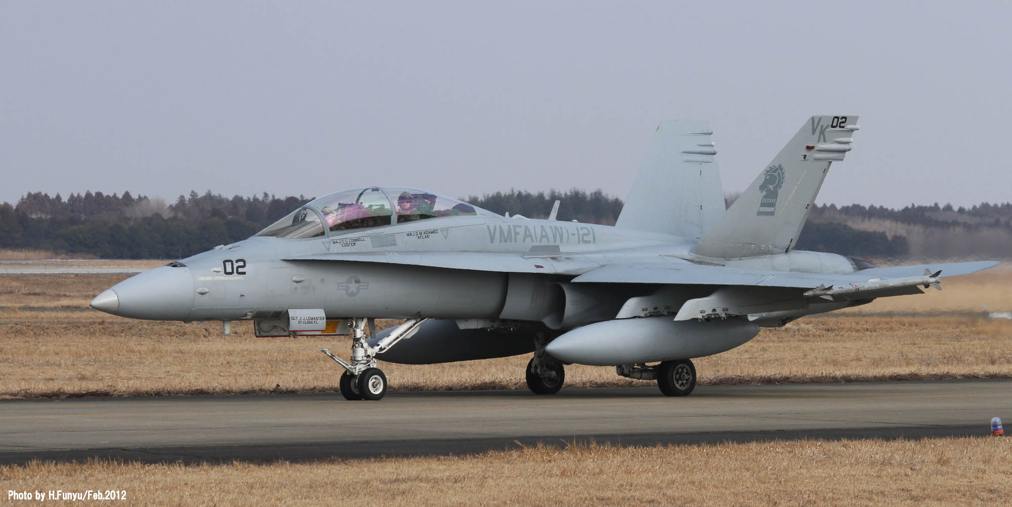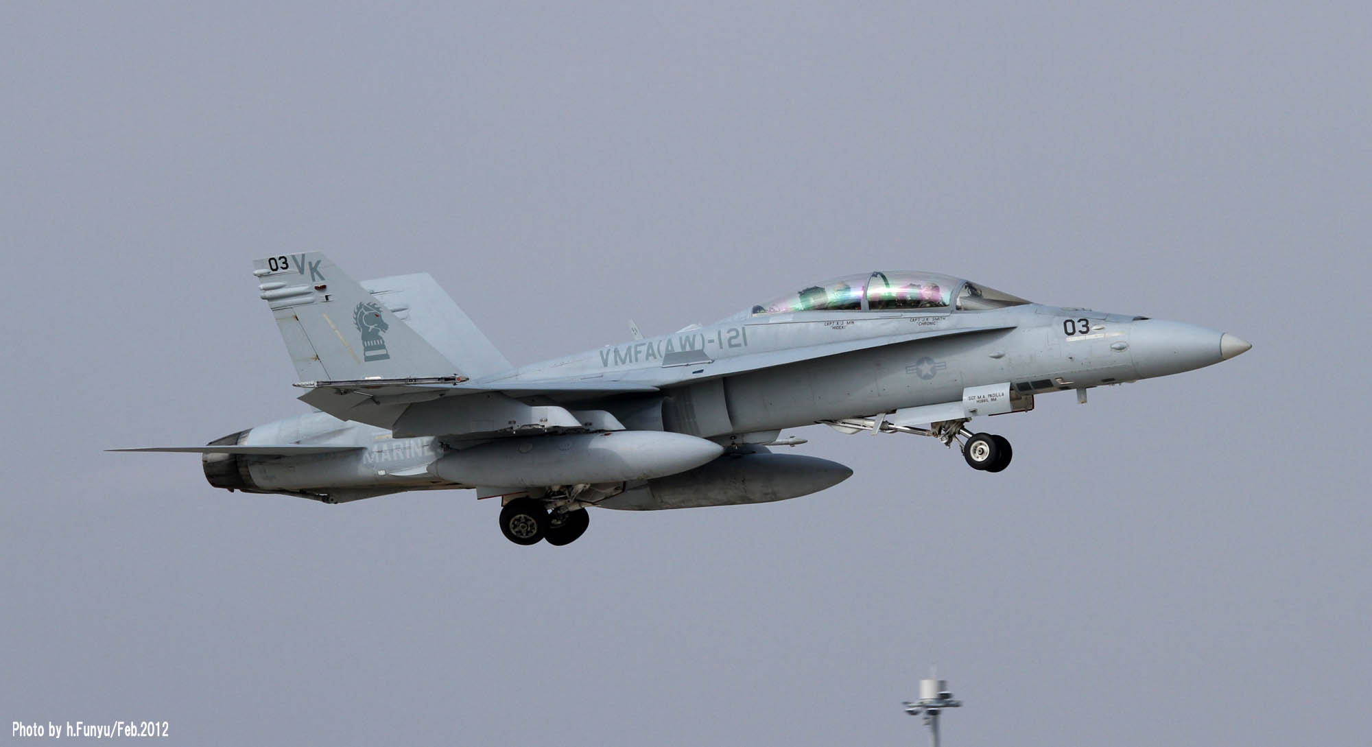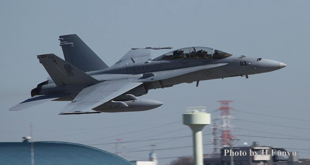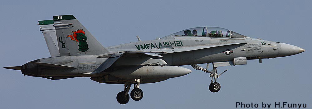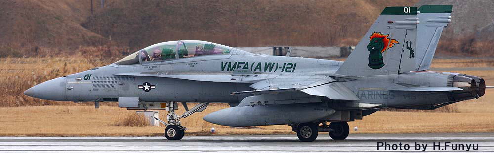嘉手納基地で残念ながら撮り逃がしたVK-01「燃えるタテガミのグリーンナイツ」であるが、年を明けた2009年 フニュフニュ君からの連絡で「厚木・横田にイモのように来ているよ・・」との連絡が入った。その後写真を送っていただいたが、何と降り・タキンシング・離陸と3点セットでパーフェクトに押さえているではないの・・ぐやじい・・・普段マリーンにはあまり恵まれない厚木基地もVMFA(AW)-121については、2009年の1-2月はふんだんに撮れたそうである。