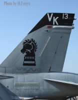↑ 2013年に登場した13番機、ATARS装着機、特別に塗装された黒の燃料タンクや尾翼に黒で入ったシェブロンに13の文字が、2013年以外に何かの意味がありそうである。日本でも厚木への飛来 岩国での展示で注目されたマーキング。何故か、MARINEの文字だけは、ライトグレーとなっている。F/A-18D