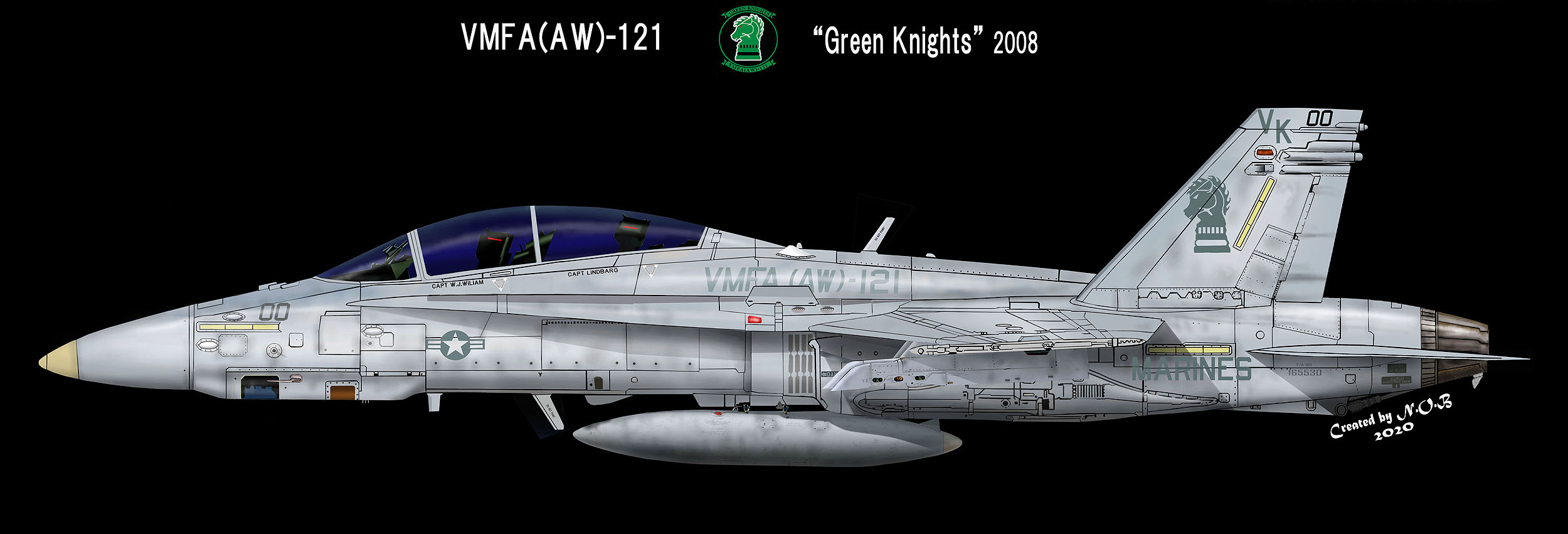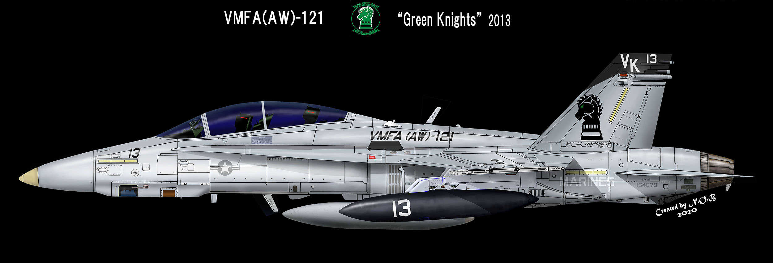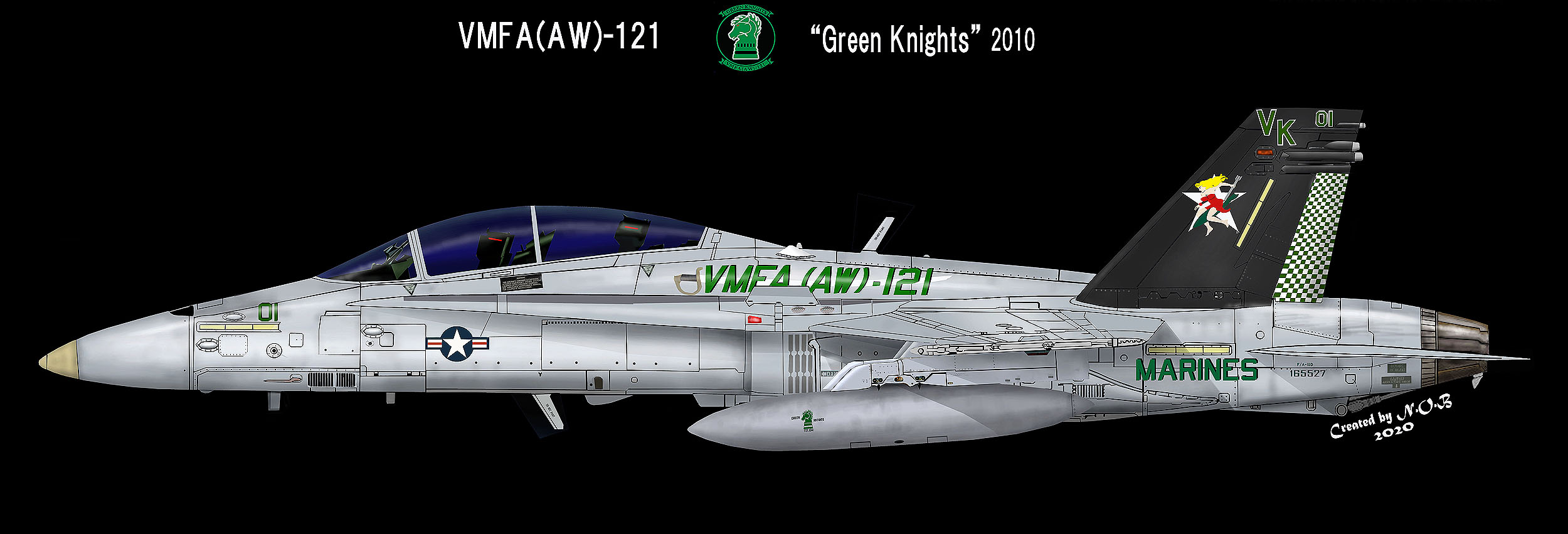 海兵航空隊はここ最近、部隊のインシグニアを創設当時のものに戻し、昔を懐かしむのがブームになっているようである。特に太平洋戦争や朝鮮戦争中に活躍した飛行隊は、その栄光をもう一度とばかり昔のインシグニアなどを復活させているがVMFA(AW)-121もその一つである。2010年8月に司令官機を新塗装に変更 そこには従来のグリーン・ナイツは無かった。この新塗装には部隊から6名の隊員が参加して2週間かけて仕上げたらしい。尾翼にある赤いドレスを着て爆弾に跨っている女性は”Bombing