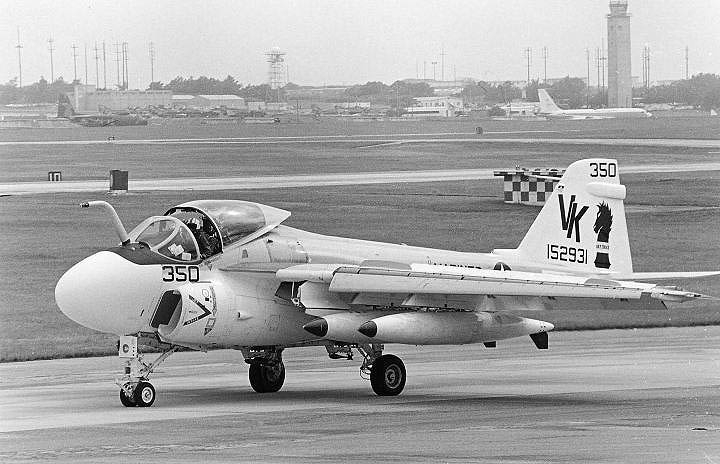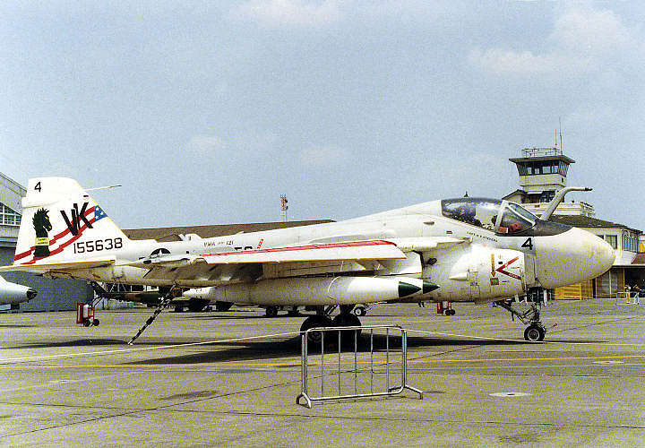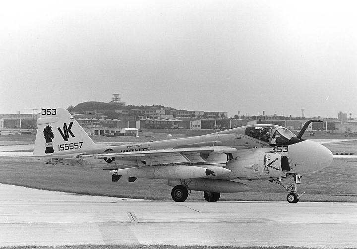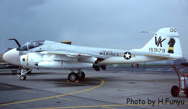 A-4を使用後 1969年に全天候型攻撃機A-6を受領し VMA(AW)-121となったもの。A-6Eになって岩国に配備されたのは1977年の5月で 尾翼に建国200周年記念の帯を入れた派手な姿で我々を楽しませてくれたが 年末までにはこの帯は消されてしまった。1989年12月FA-18Dを受領し VMFA(AW)-121に部隊ナンバーが再び変更されている。