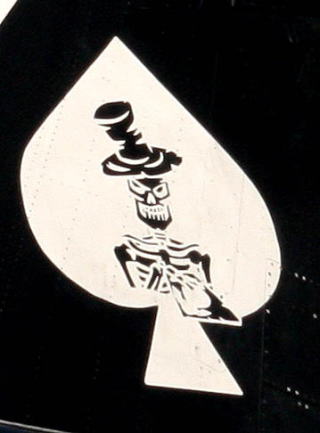 第2次大戦中にVMF-225が使用したインシグニア。このスペードと骸骨のオリジナルマークが2007年から 尾翼に復活した。この髑髏君「死のカードをどうぞ!」と言っている。