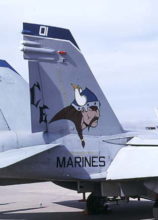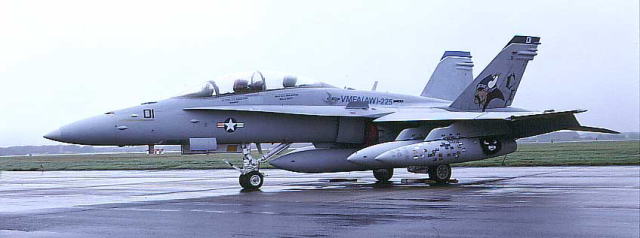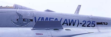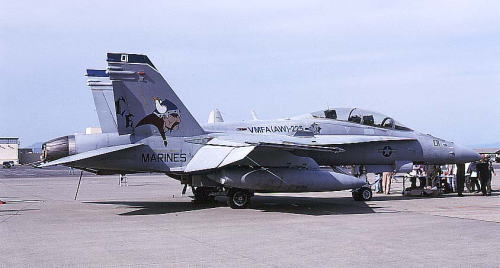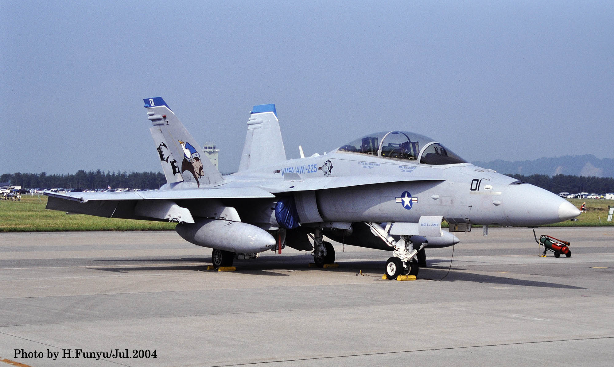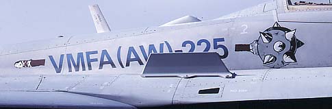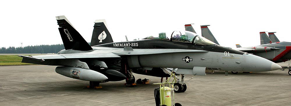 2002年横田基地OHに展示された2機のVMFA(AW)-225のFA-18D。よ〜く見ないとバイキングとわからないぐらい薄いグレー色のロービジであるが、CE-08のパッケージポットは、やたら派手な落書き(失礼!)が入っている。