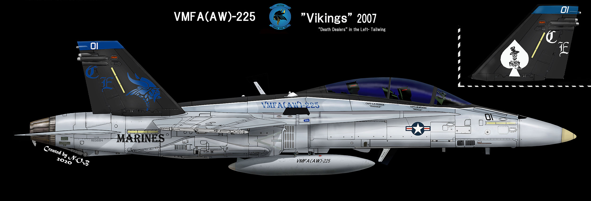 ↑2007年バイキングスは、ショーバードのデザインを大きく変えた。ブラックテールにしたうえ 以前のインシグニア「デス・ディラー」を尾翼に取り込んだ。この機体は、左右の尾翼外側にデザインが異なる。右尾翼は「デス・ディラー」が書かれており、左側は、ダークブルーでバイキングが描かれた。F/A-18D Bu.No.165684