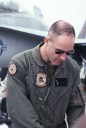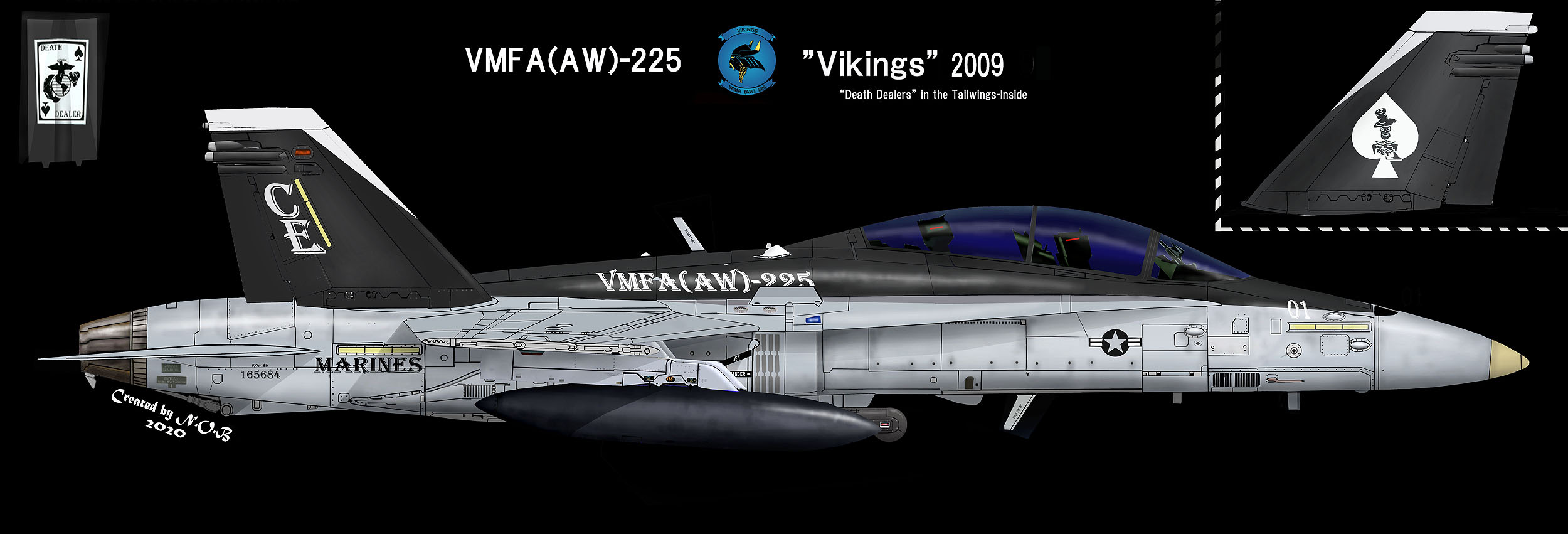 ↑ 2009年に登場したブラックテール機は、バイキングの絵柄が消え 両尾翼ともに外側にテールレター「CE」、尾翼内側に「デス・ディラー」が書かれている。ショーバード以外の機体は、いつも通り青いラインとバイキングの図柄であった。F/A-18D Bu.No165684