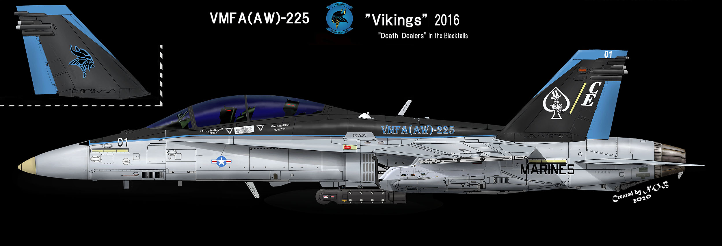 ↑ 2016年ショーバードは再びブラックテールが復活し、各所にスコードロンカラーのマリンブルーを使った美しいデザインとなった。両尾翼ともに外側にデス・ディラー、内側がバイキングの横顔となっている。F/A-18D