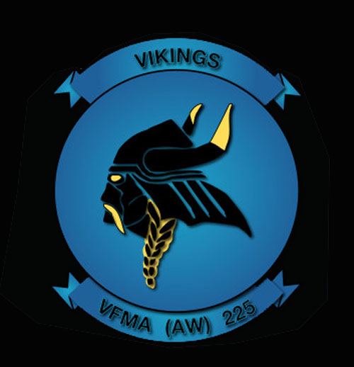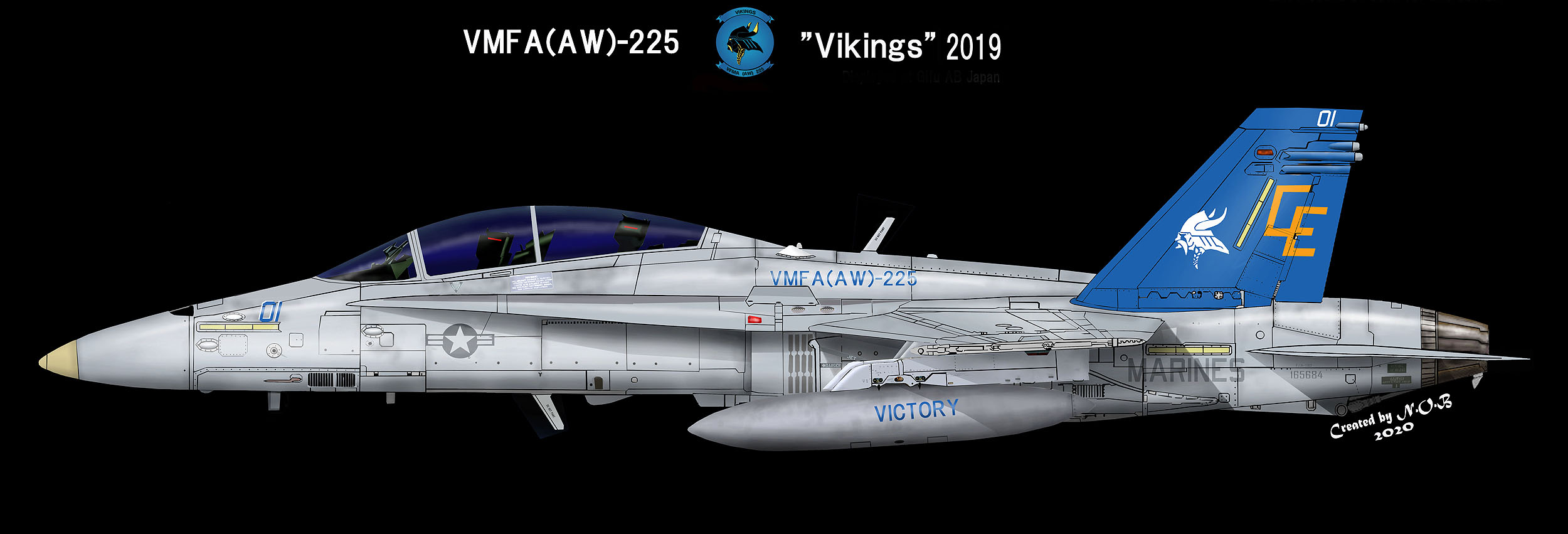 ↑ 2019年ミラマー海兵隊基地に展示されたショーバードCE-01は、初めての全面ブルーテールで、シンプルにバイキングの横顔が書かれた。テールレターの書き方もショーバード以外の機体と同じ形式に戻っている。F/A-18D Bu.No.165684
