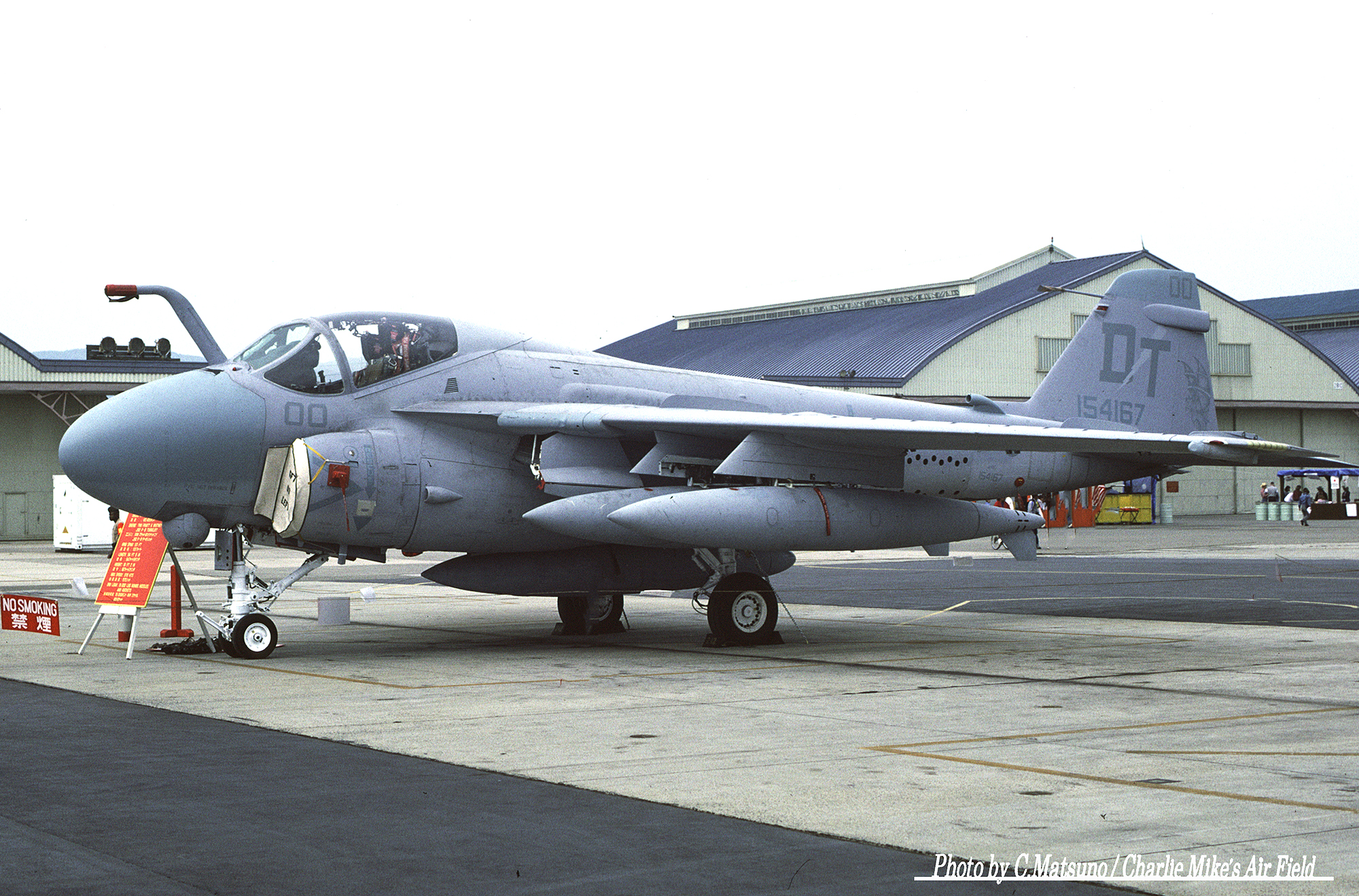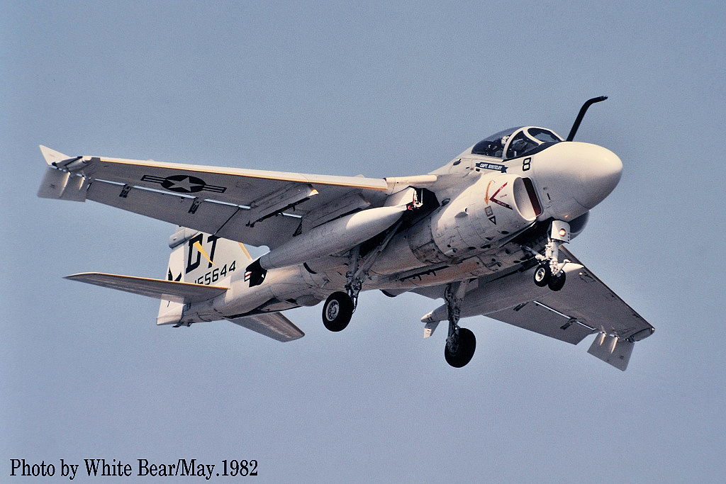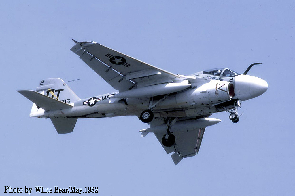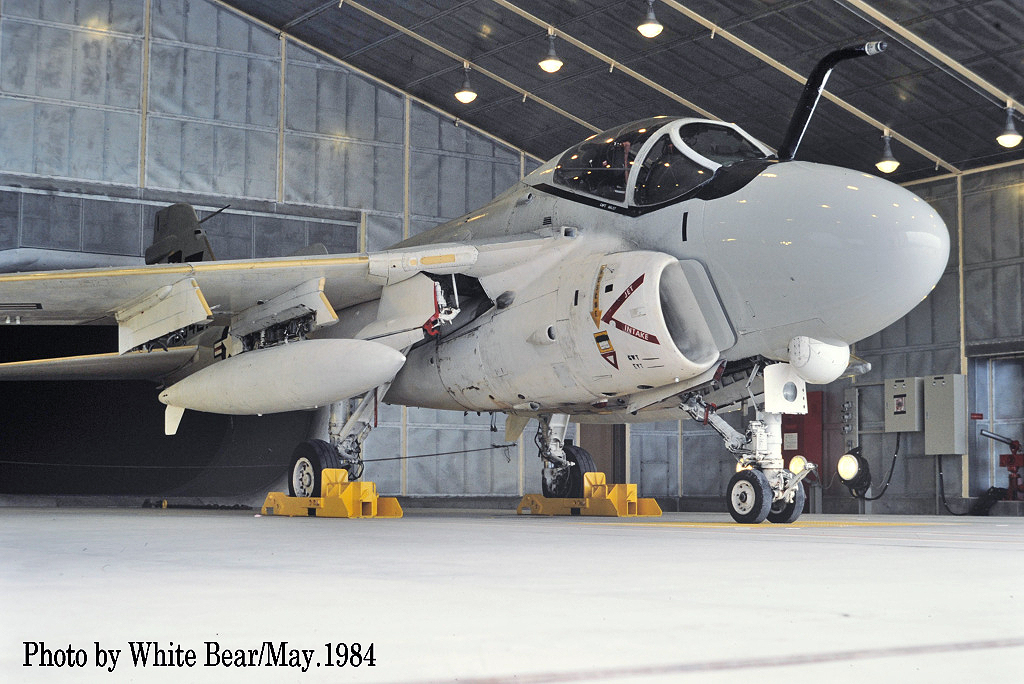 ↑ White Bearさんが、1984年5月の岩国基地航空祭で撮影されたA-6Eで、この年は機首下面に目標探知複合センサー通称”TRAM”が追加された機体が展示された。尾翼のマーキングが写真では判らないが、機体は下面がライトグレーであり又注意書きも色付きで、完全なロービジ塗装ではない。