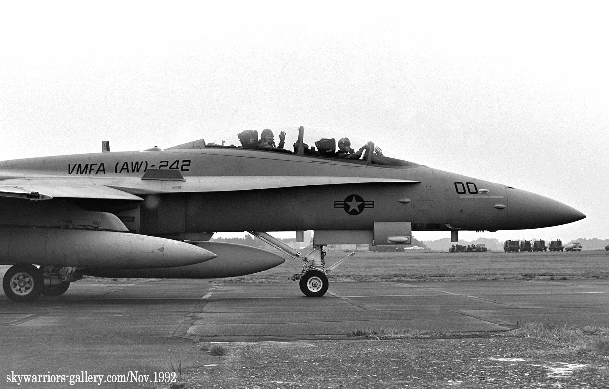 ↑ 1992年11月 浜松基地に展示されたVMFA(AW)-242のFA-18D 2機は、岩国への帰投の際、観衆の前をゆっくりとタキシーして行く。天気は悪かったが、厚木基地では中々撮れない近距離からのタキシングシーン。