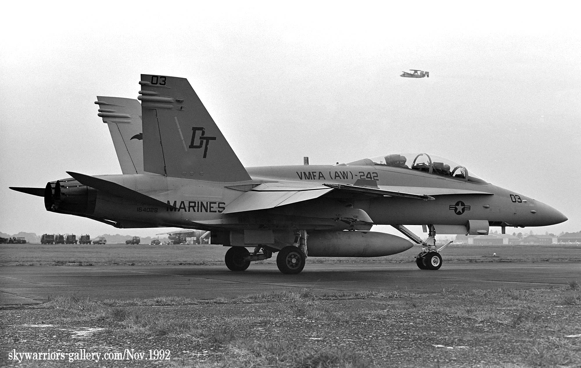 ↑ 1992年1月にアメリカ本国で撮影されたVMFA(AW)-242のFA-18D/DT-11/Bu.No.164263。彼らは1991年2月に部隊として最後のFA-18Dを受領して定数を見たし約1年になろうとしていた。盛んにエルトロ海兵隊基地で海外派遣に備え準備をしていたはずである。日本の岩国基地に配備される直前の写真であり、撮影場所は不明ながら興味深い写真である。