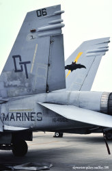 ↑ 2004年9月よりオペレーション・イラク・フリーダムでアル・アサド基地に派遣された際、DT-01は、機体と塗装を変え、上のような黒とグレーだけのシックなマーキングに変わった。オカルト風文字は、前年のマーキングをそのまま踏襲している。F/A-18D Bu.No.165528