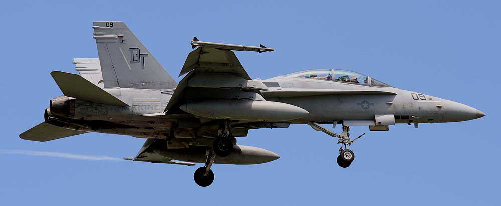 ルーズな3機編隊(2機編隊+1?)で嘉手納に帰ってきたDTのFA-18D。 2010年8月25日11:40分
