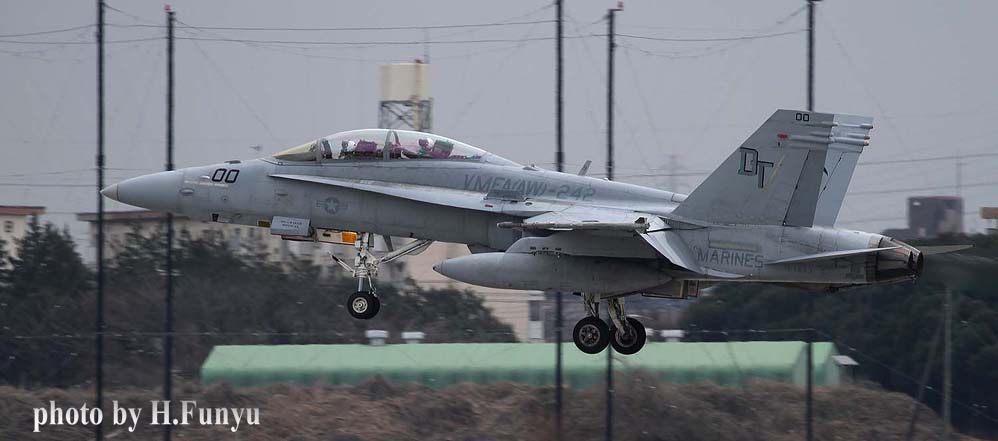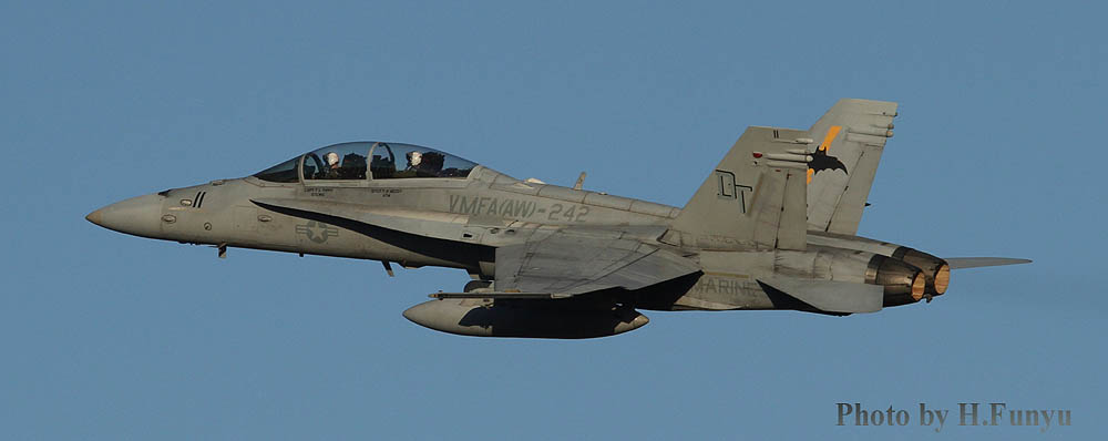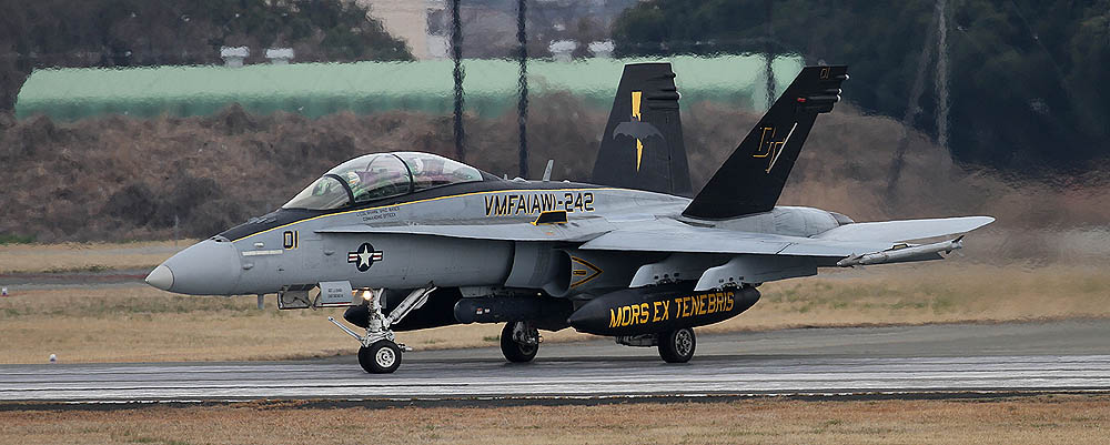↑ VMFA(AW)-242 の隊長機新塗装・・昔のデザインの踏襲であるが一番それらしいマーキングに回帰してくれた。”暗黒からの死”のロゴが燃料タンクに移ったのが特徴。作品は全てフニュフニュ君が、2016年3月12日に厚木で撮影したものである。私の好きなタキシング・・・羨ましい限りだ。フニュ君毎回有難うございます。