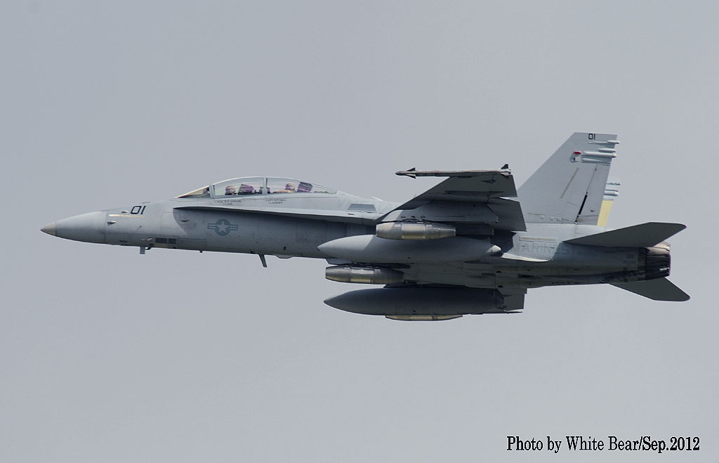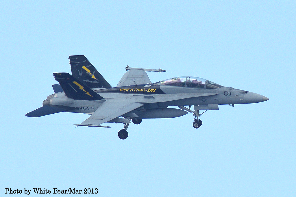 ↑ White Bearさんが、2013年3月嘉手納基地R/W-05で撮影されたVMFA(AW)-242のFA-18D/DT-01。真新しいショーバードの姿である。