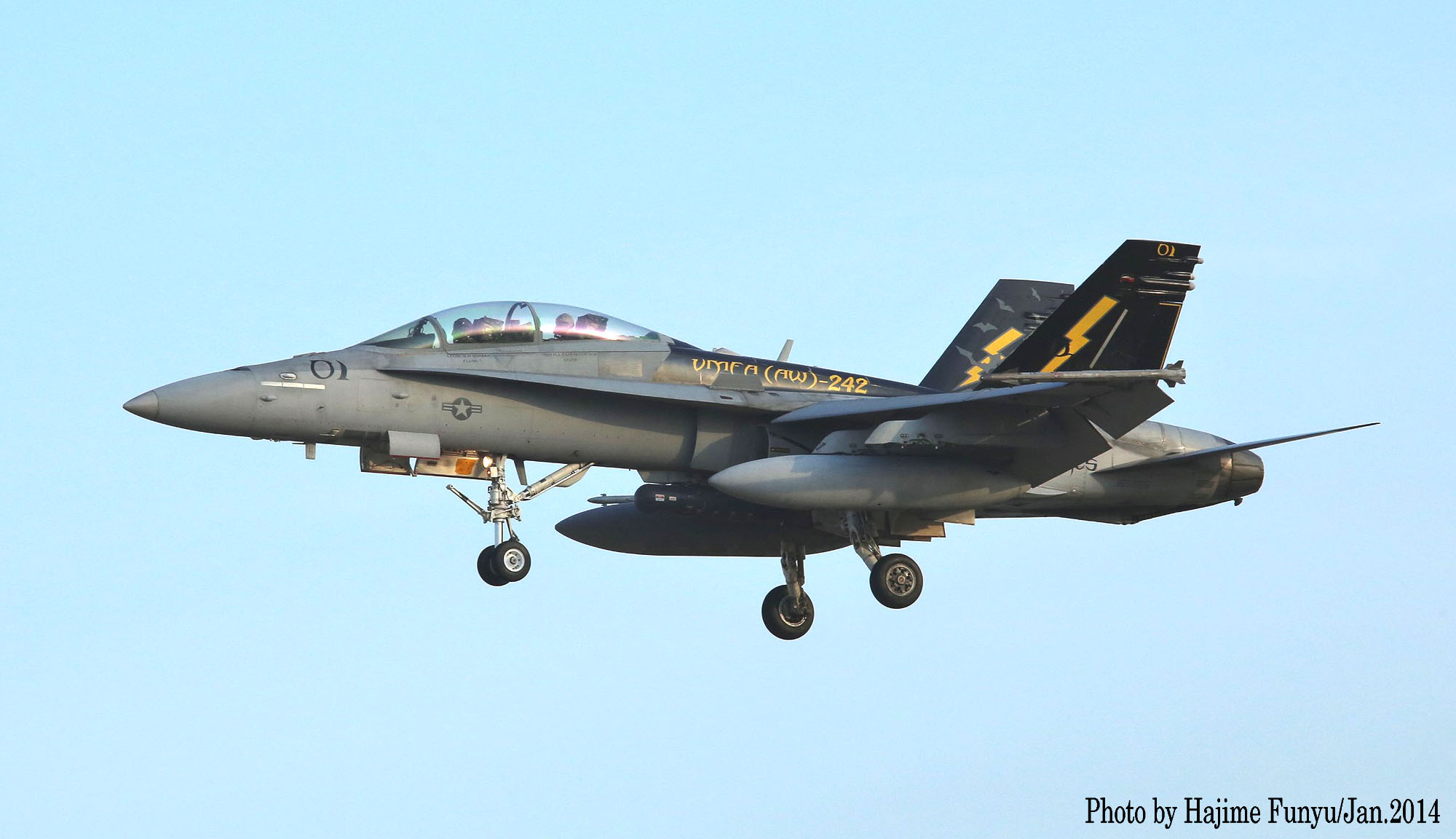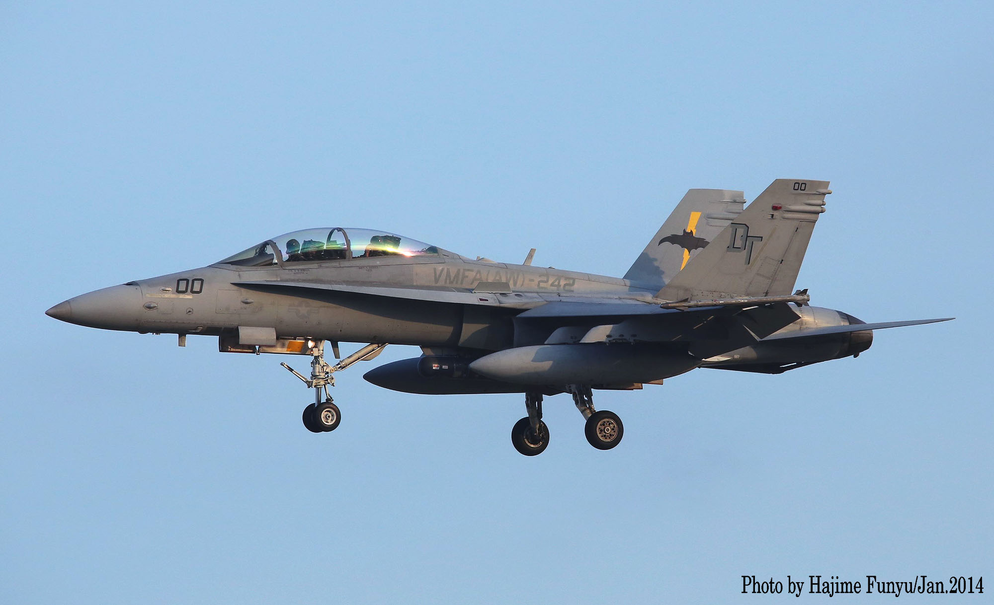 ↑ 2014年1月 厚木基地でのローカルフライトを終え岩国基地の戻るVMFA(AW)-242のFA-18D。オカルトバッド君の低い離陸で、尾翼内側に書かれた群れて飛ぶ蝙蝠の絵柄が良く判る。フニュフニュ師匠の撮影。