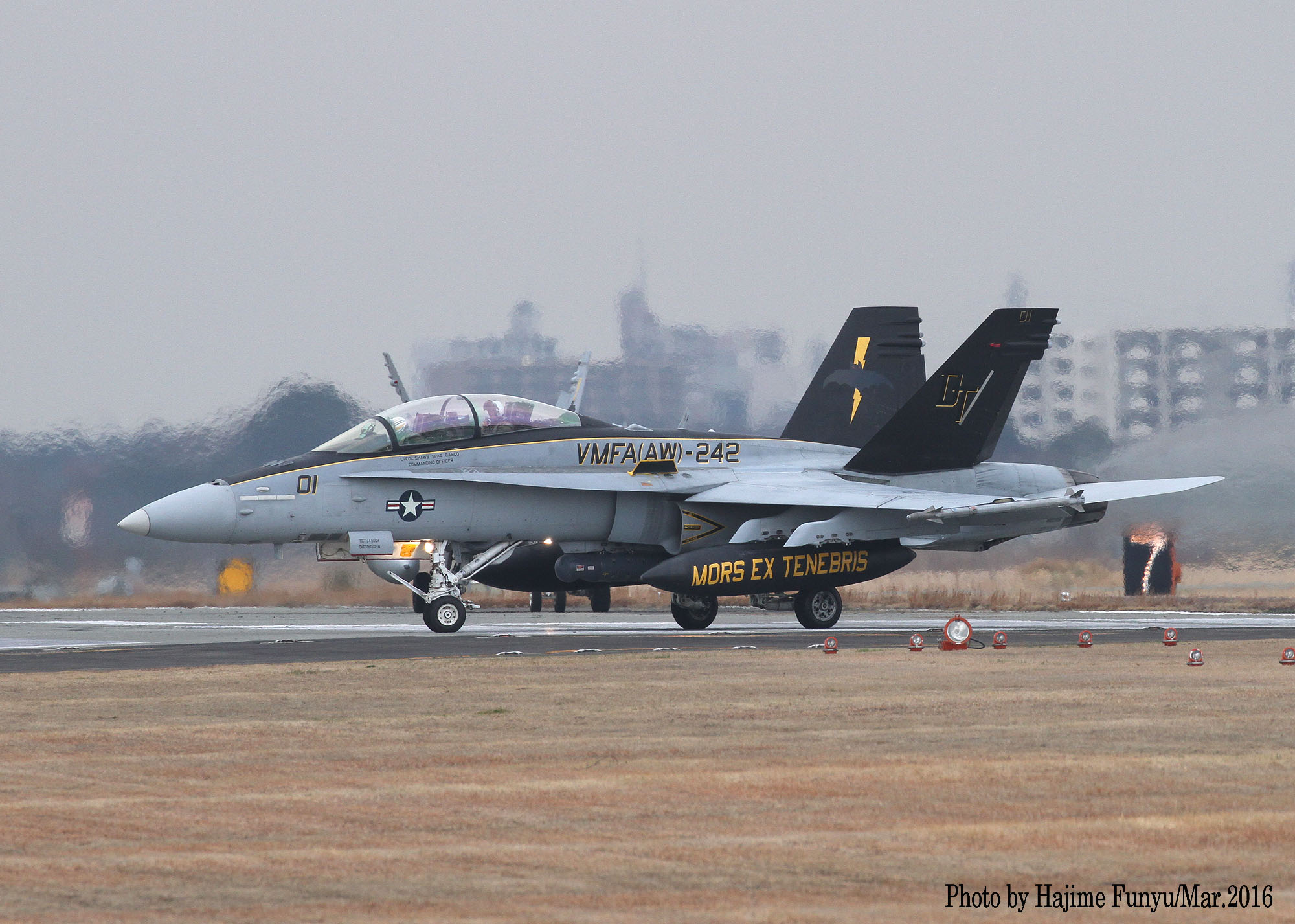 ↑ VMFA(AW)-242 の隊長機新塗装・・昔のデザインの踏襲であるが一番それらしいマーキングに回帰してくれた。”暗黒からの死”のロゴが燃料タンクに移ったのが特徴。作品は全てフニュフニュ君が、2016年3月12日に厚木で撮影したものである。私の好きなタキシング・・・羨ましい限りだ。フニュ君毎回有難うございます。